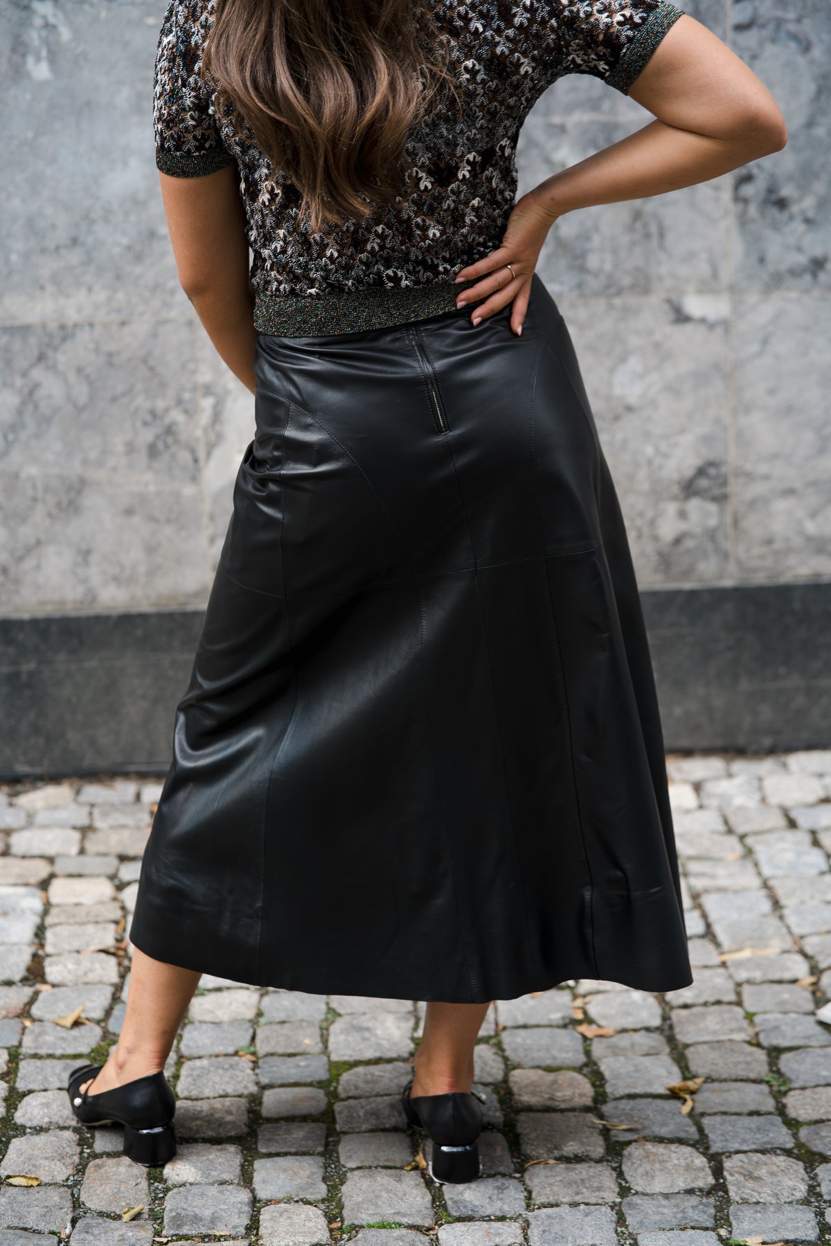 Indrina Lamb Easy fra Arma. Et skinnskjørt i A-linje som kombinerer tidløs stil med et moderne design. Det er laget av mykt, høykvalitets skinn, med en flatterende silhuett som elegant faller til midilengde. Dette er perfekt å style til både formelle og uformelle anledninger, og kan styles både opp og ned.