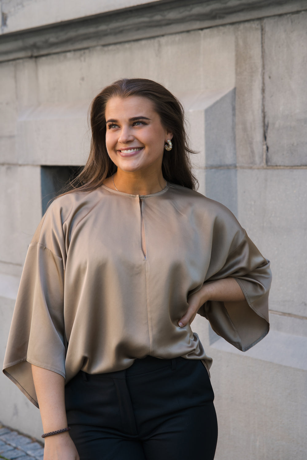 Cicie er en oversized bluse, med videre, albuelange armer. Blusen har en rund hals, med knapp øverst i halsen som kan åpnes opp for et mer avslappet uttrykk. Kombiner gjerne med matchende bukse for en monokrom look. Et kjempefint alternativ til kjole.