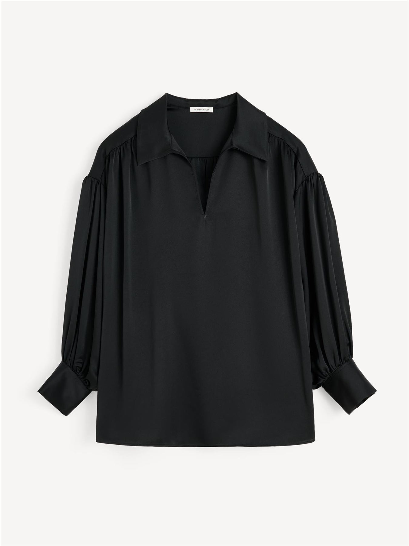 Leonora-blusen er designet i et minimalistisk snitt som gjør den tidløs og allsidig – et perfekt tilskudd til enhver garderobe. Den er laget i en luksuriøs sateng med en tunikainspirert silhuett, skarp krage, V-utringning og mansjetter med knapper. Små sidesplitter gir en elegant bevegelse, og et diskré brodert monogram tilfører en subtil detalj.