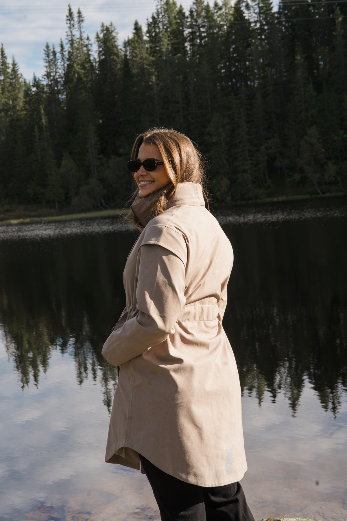 Monsun Coat fra BRGN. Den takler været uten å ofre stil! BRGN jakker er designet for å møte de utfordrende værforholdene i Bergen, Europas mest regnfulle by. Denne jakken er vann- og vindtett med en vannsøyle på 20 000 samtidig som den puster. Du kan enkelt tilpasse passformen med båndet i midjen. Hetten er skjult i nakken med en diskré glidelås.