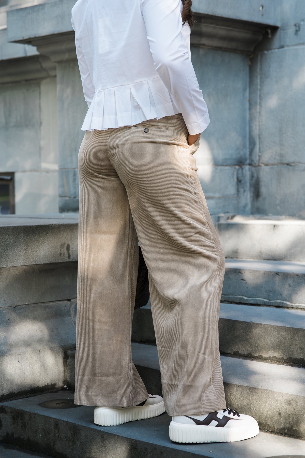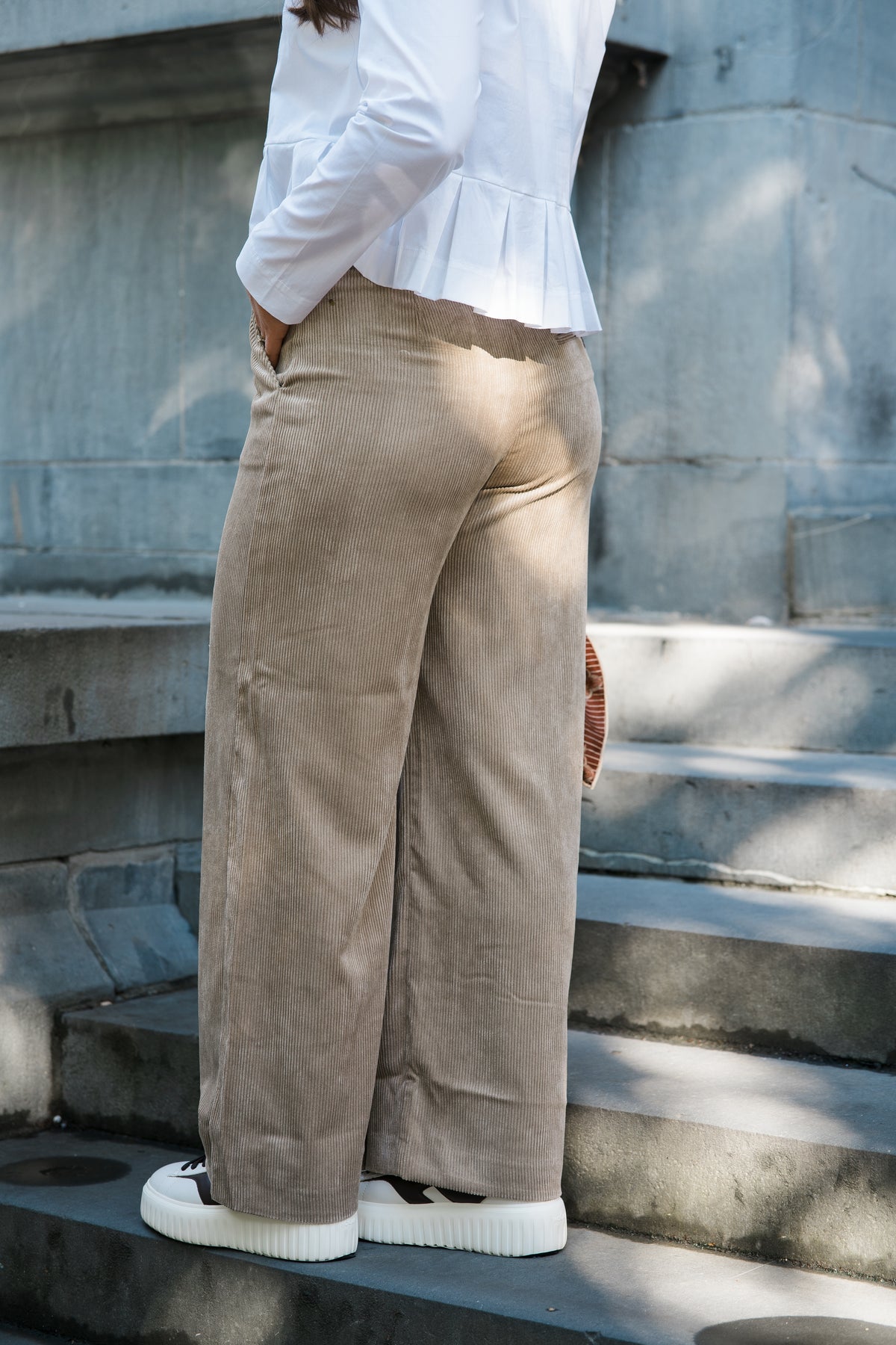 Lelouis fra Munthe. Disse buksene er laget i en deilig kordfløyel, som gir en behagelig og luksuriøs følelse som er perfekt for enhver anledning. Buksen har en bred passform, høy på livet og lommer på siden.