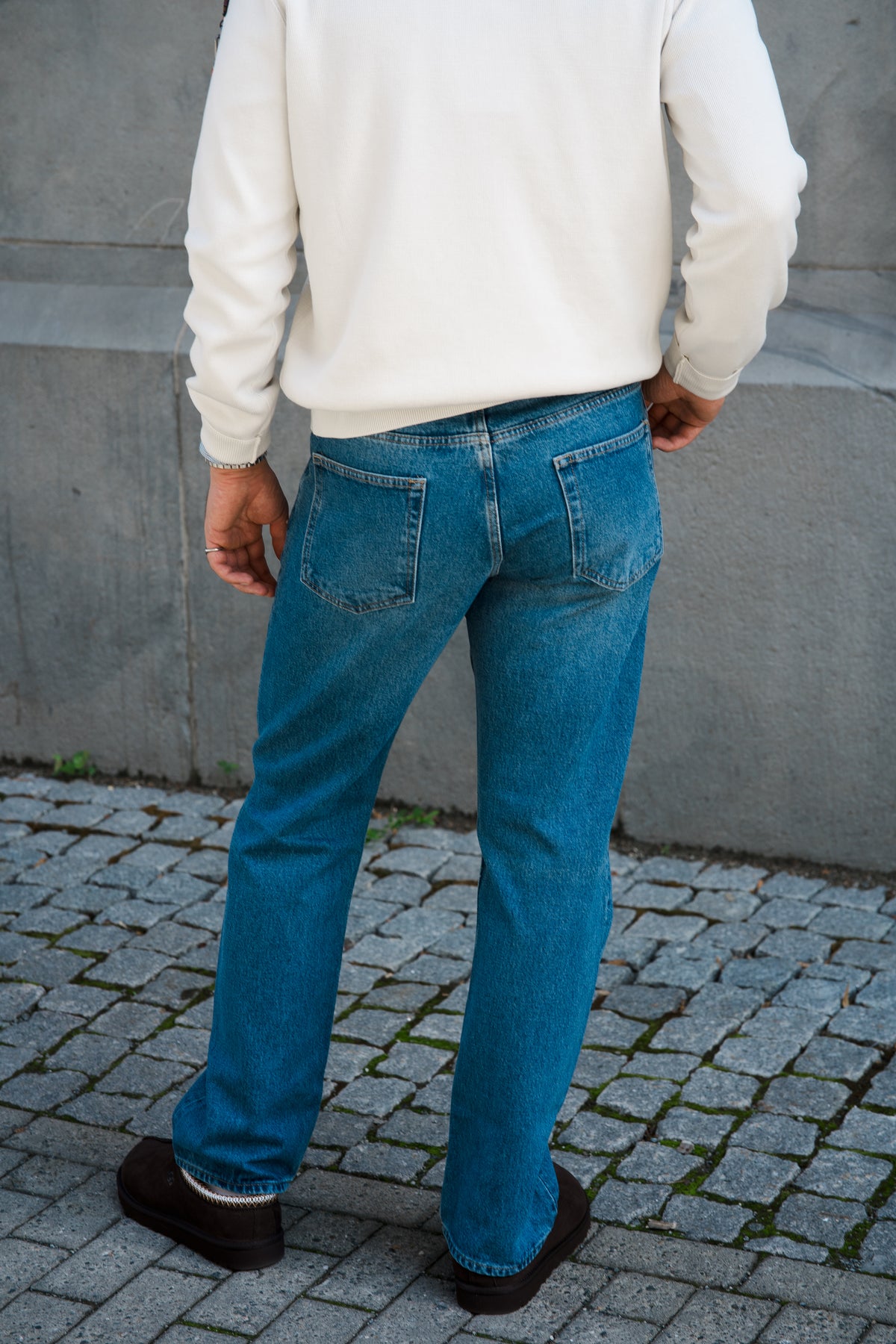En mørkeblå jeans med rett passform og en komfortabel, litt romsligere silhuett. Laget i et mykt denimstoff med kontrastsømmer, metallknapp og nagler som gir et klassisk uttrykk. En tidløs jeans som passer like godt til hverdags som til en mer oppkledd stil.