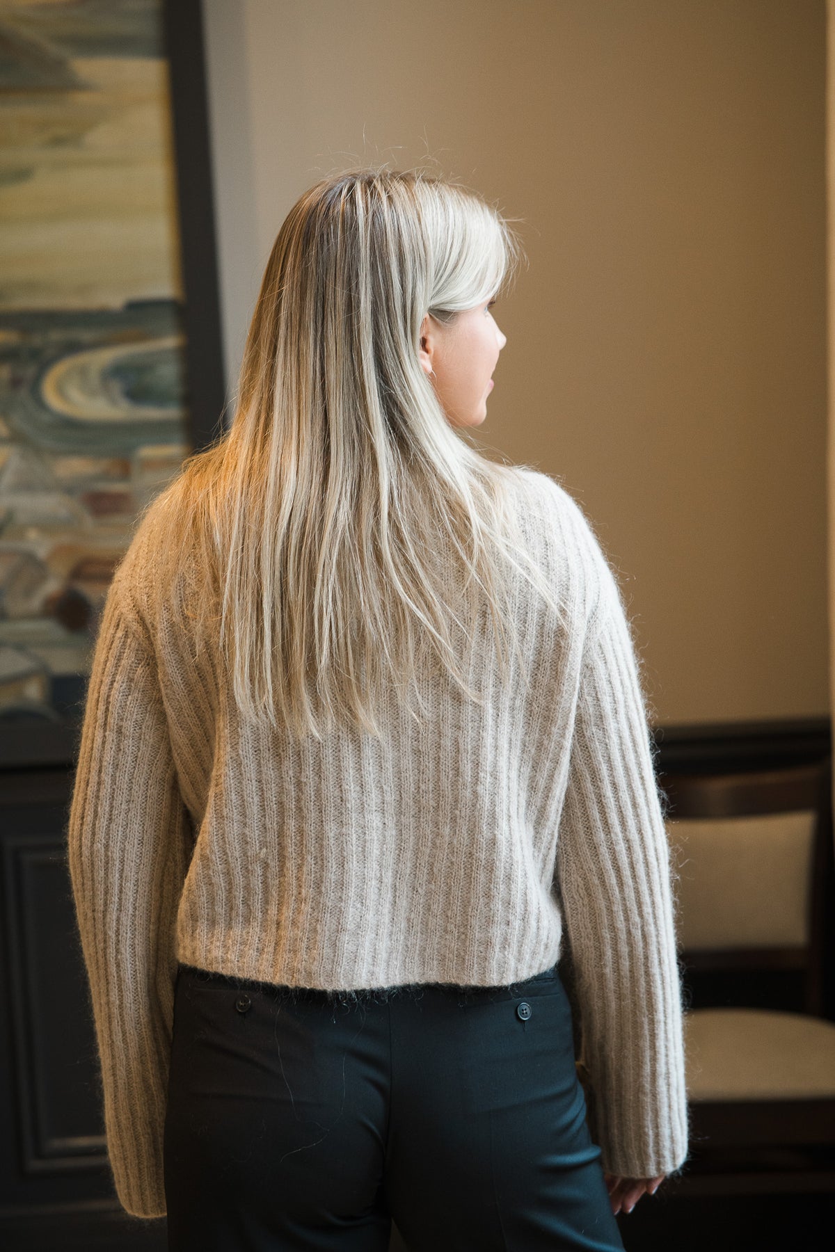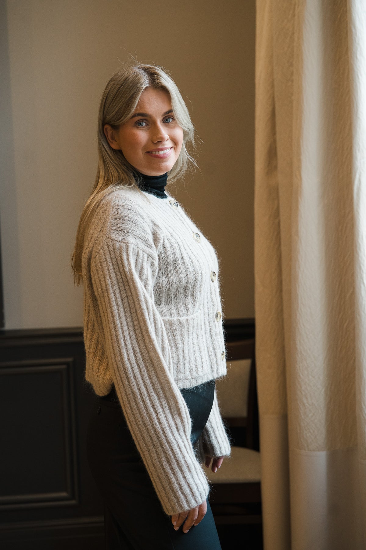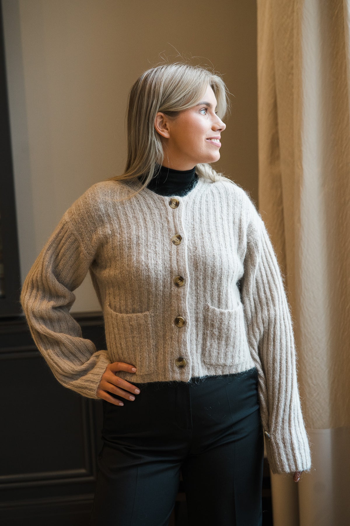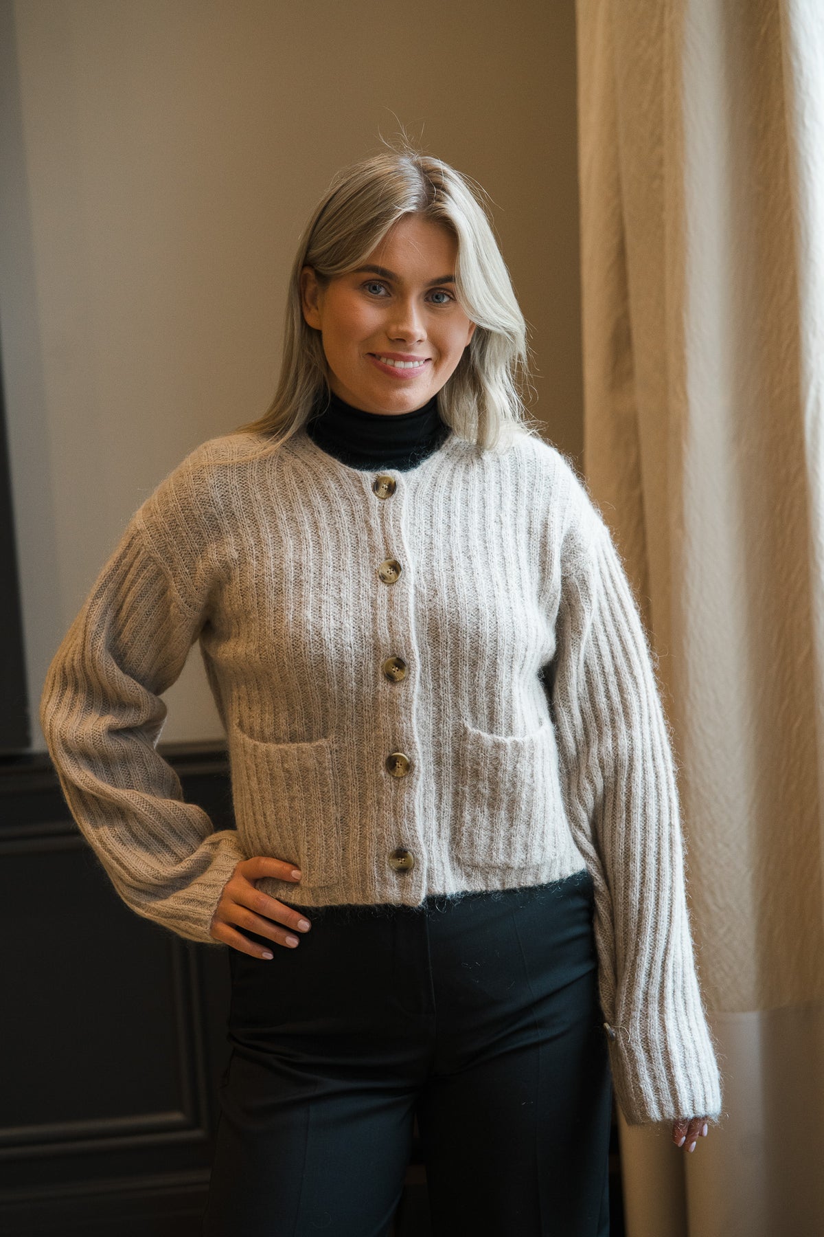 Cierrou Rib Cardigan fra By Malene Birger. En cardigan i ullblanding, med en normal silhuett som er laget i ribbstoff og har tettsittende knapper og lommer foran. Denne cardiganen er perfekt å ha over en kjole, skjorte eller t-skjorte - og perfekt å style til både bukse og skjørt.