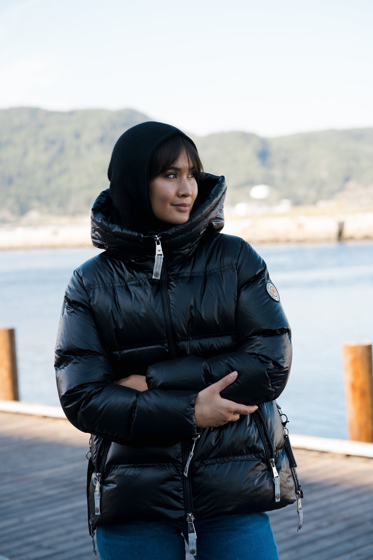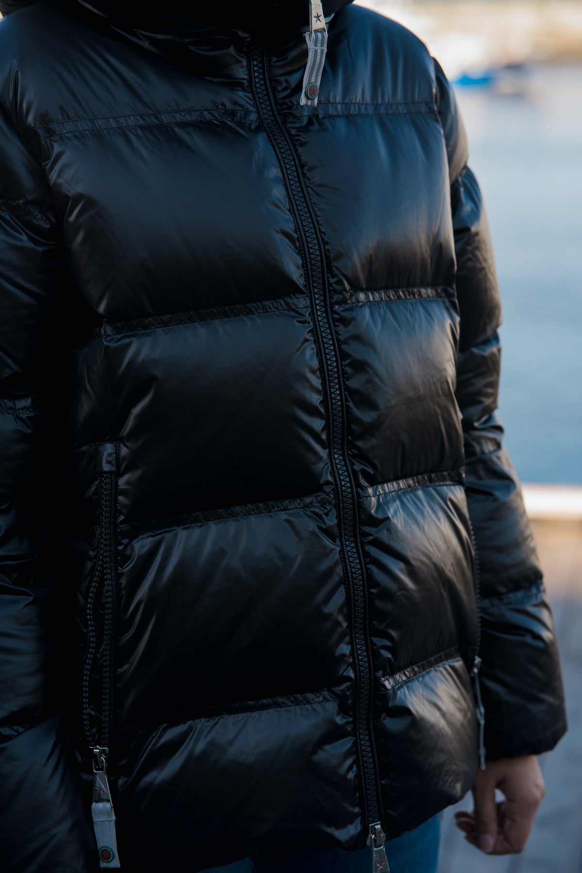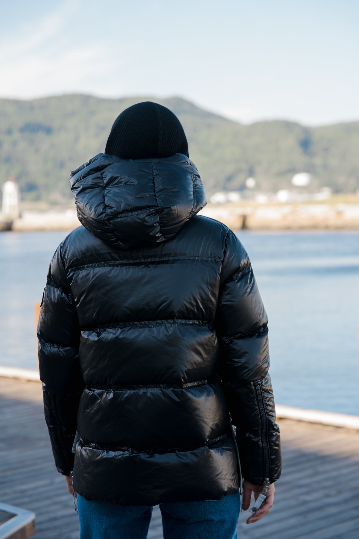 Erika er en superkul, kort dunjakke. Jakken har kule detaljer som skiller seg ut i mengden. Jakken har lommer i sidene med glidelås, splitt med glidelås i sidesømmene og remmer på innsiden. Glidelås og knappelukking foran og stor, varm hette. Jakken er fylt med 90/10 dun og fjær.