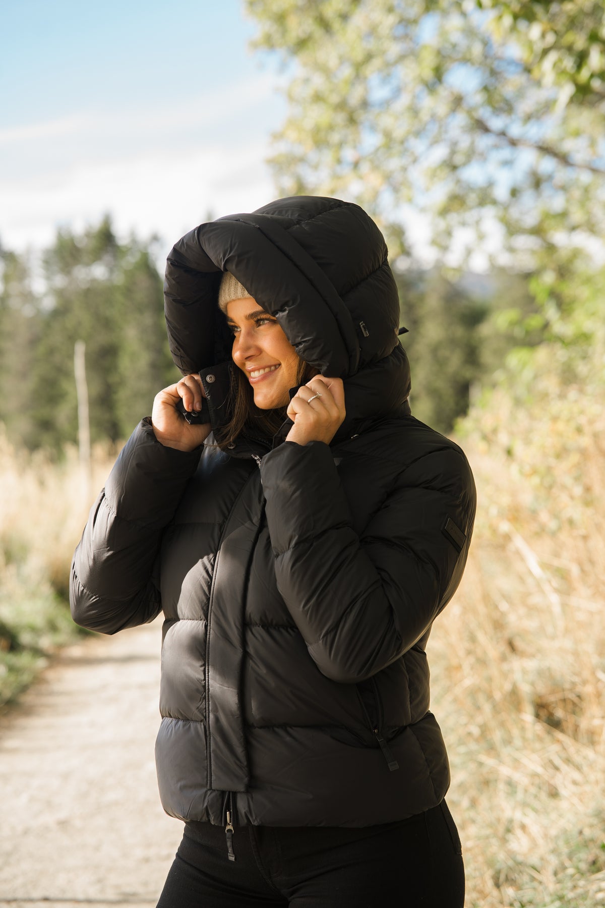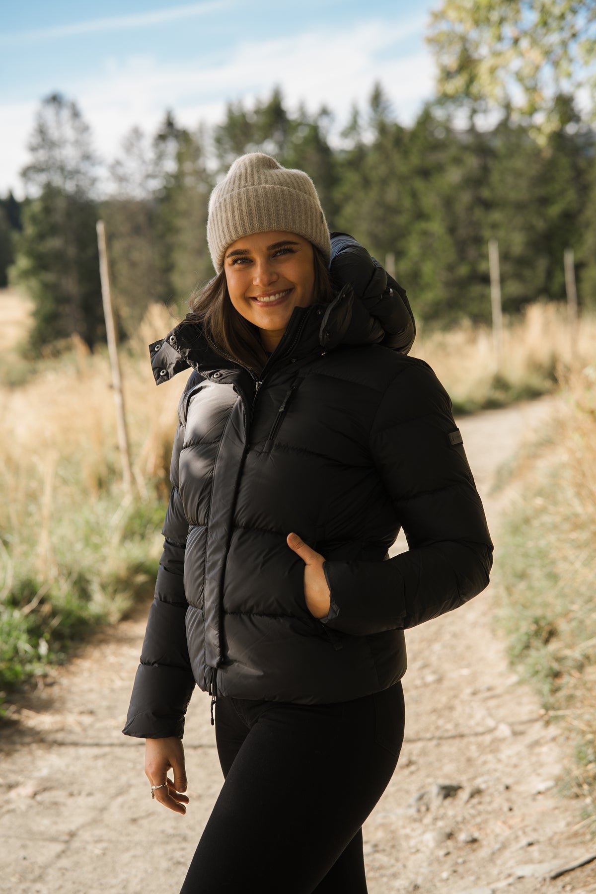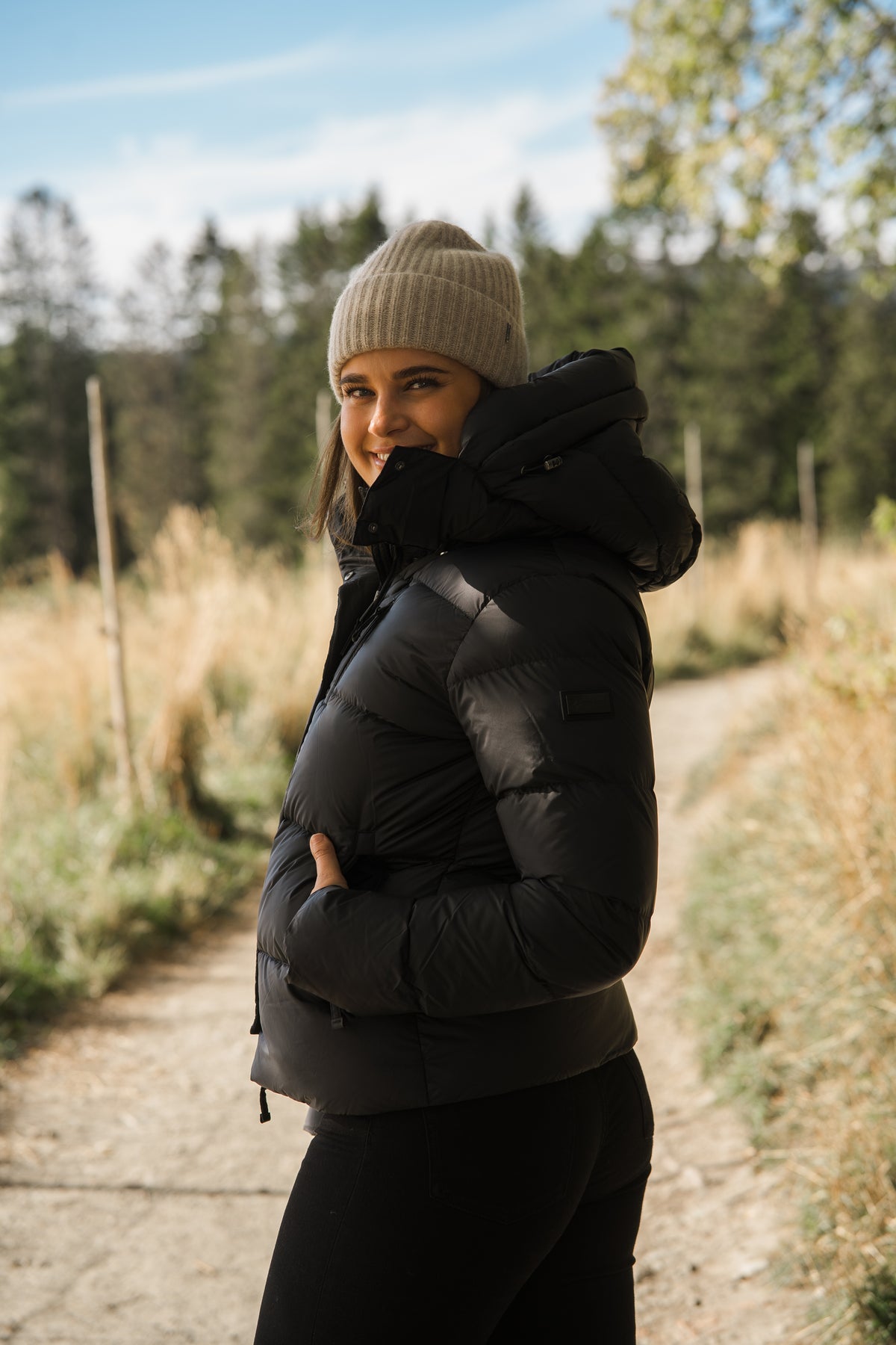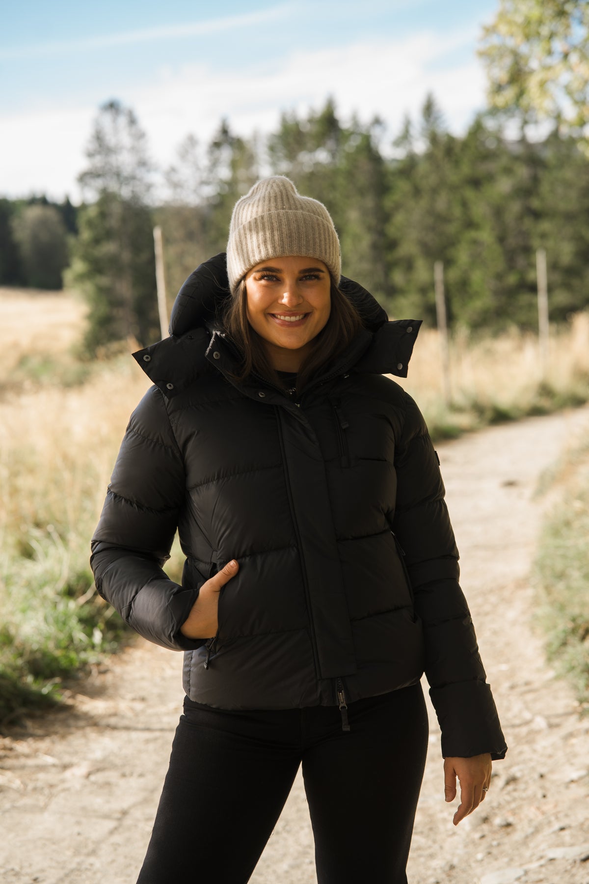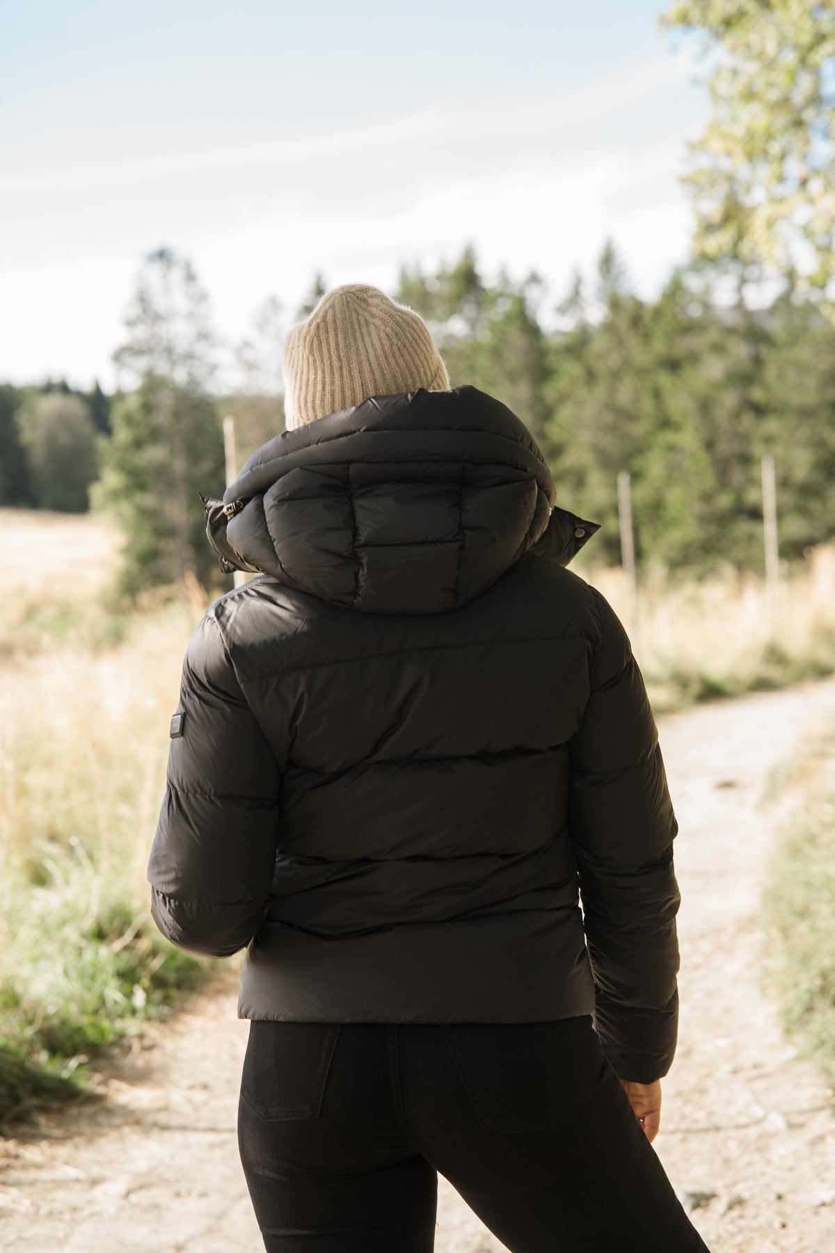Stella fra Cedrico. En deilig vinterjakke som er vannavvisende, har avtakbar hette, høy krag, en lomme på brystet og to sidelommer. En stilig og deilig jakke for de kalde årstidene. Stella er designet for å dekke dine behov fra street fashion til fjellet og alt i mellom. Med kort lengde, og 90/10 dunfyll som holder deg varm og komfortabel.