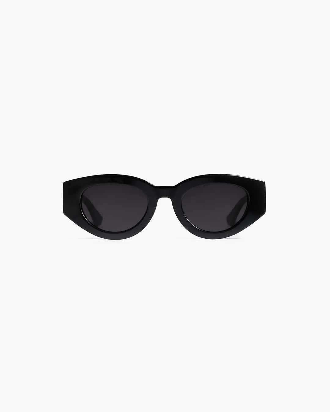 Ines er en moderne cateye modell, med en robust ramme og rund silhuett. Solbrillene er i en sort farge. Laget i bioacetat.