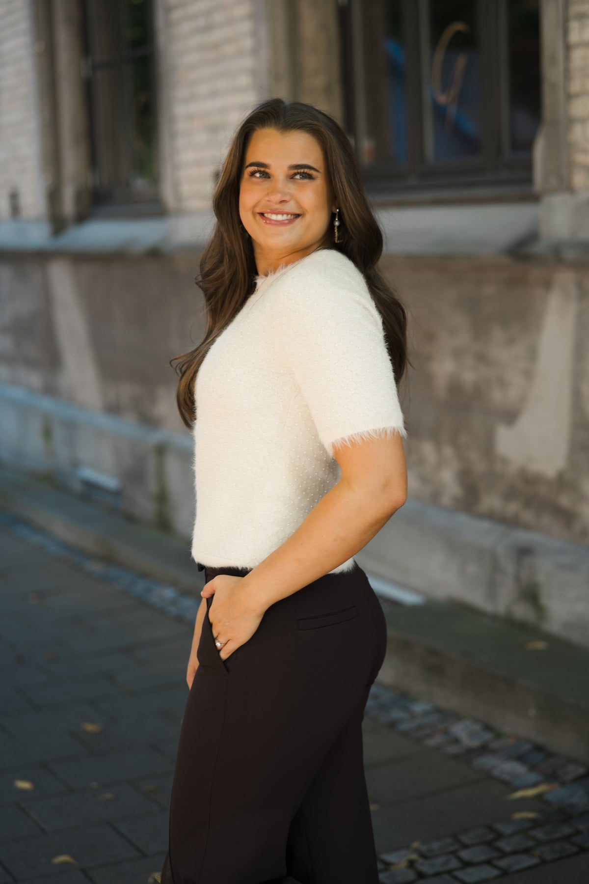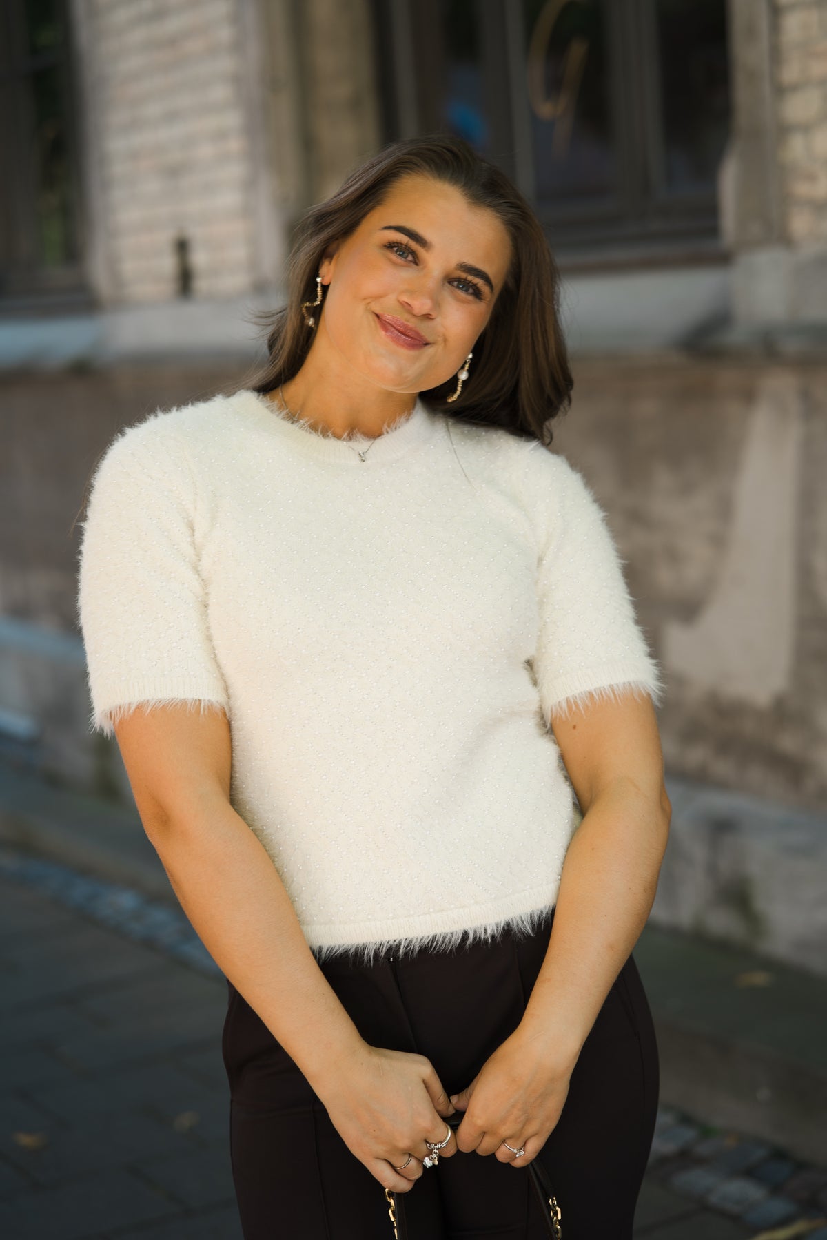 Giara fra Max Mara. En nydelig genser med rund hals, perle-detaljer over gensere med et fluffystoff, og korte ermer. Denne genseren er fin å bruke til både formelle og uformelle anledninger, og kan styles sammen med skjørt og bukse.