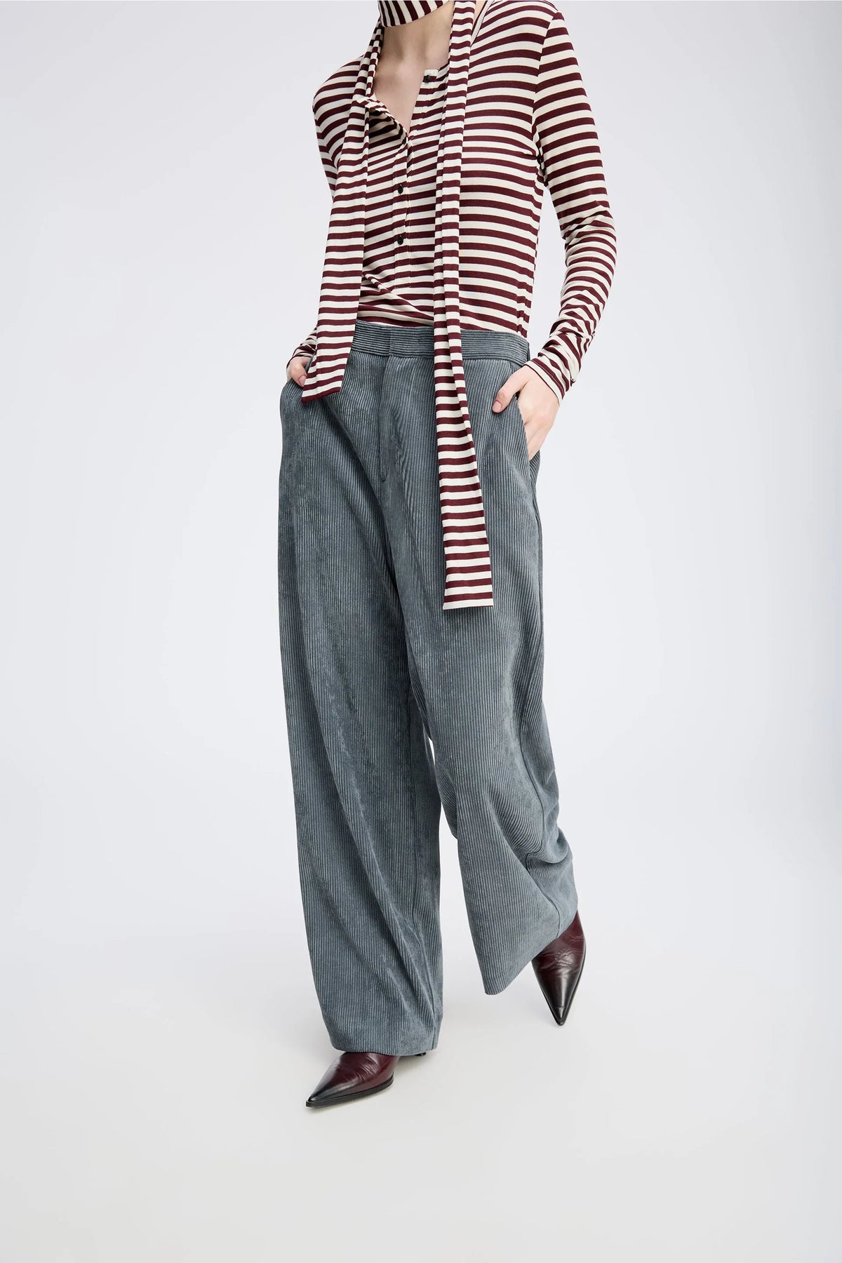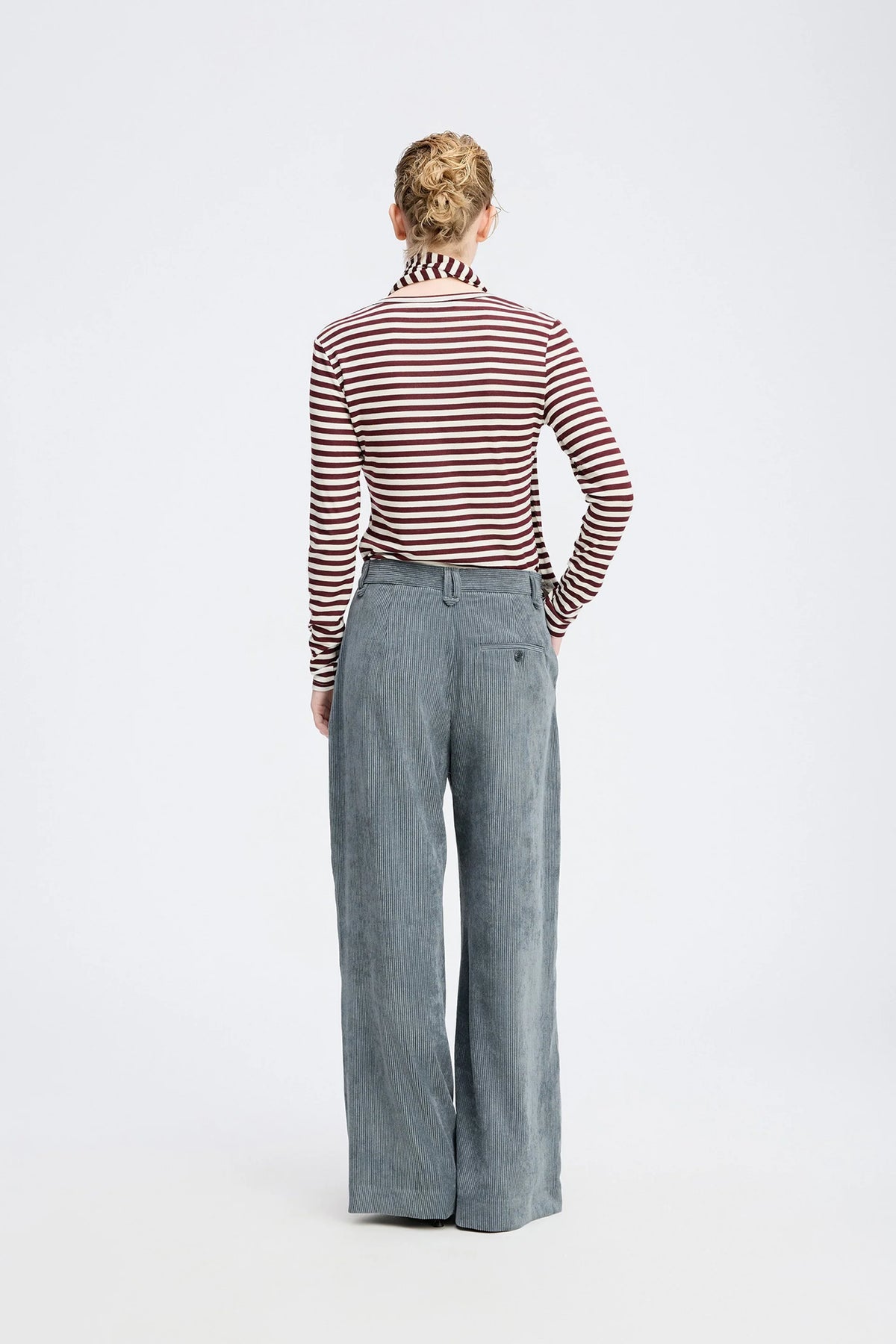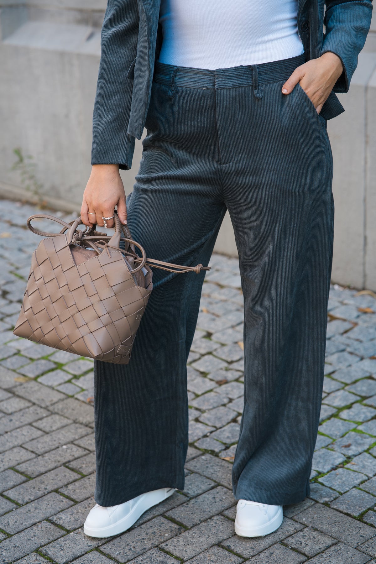 Lelouis fra Munthe. Disse buksene er laget i en deilig kordfløyel, som gir en behagelig og luksuriøs følelse som er perfekt for enhver anledning. Buksen har en bred passform, høy på livet og lommer på siden.