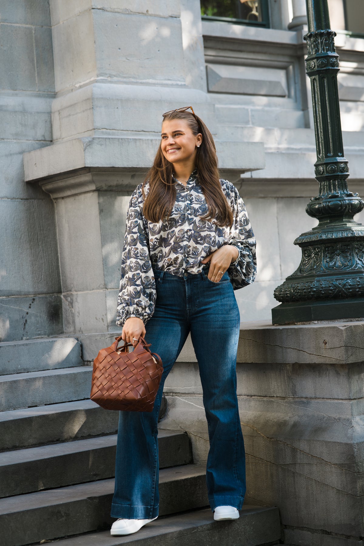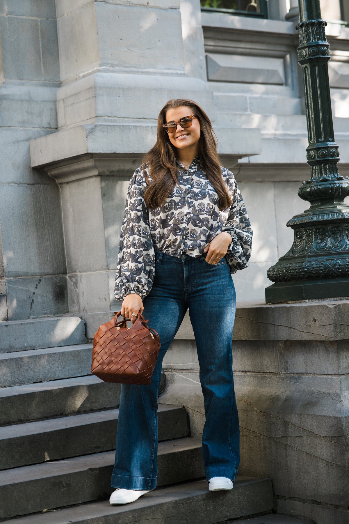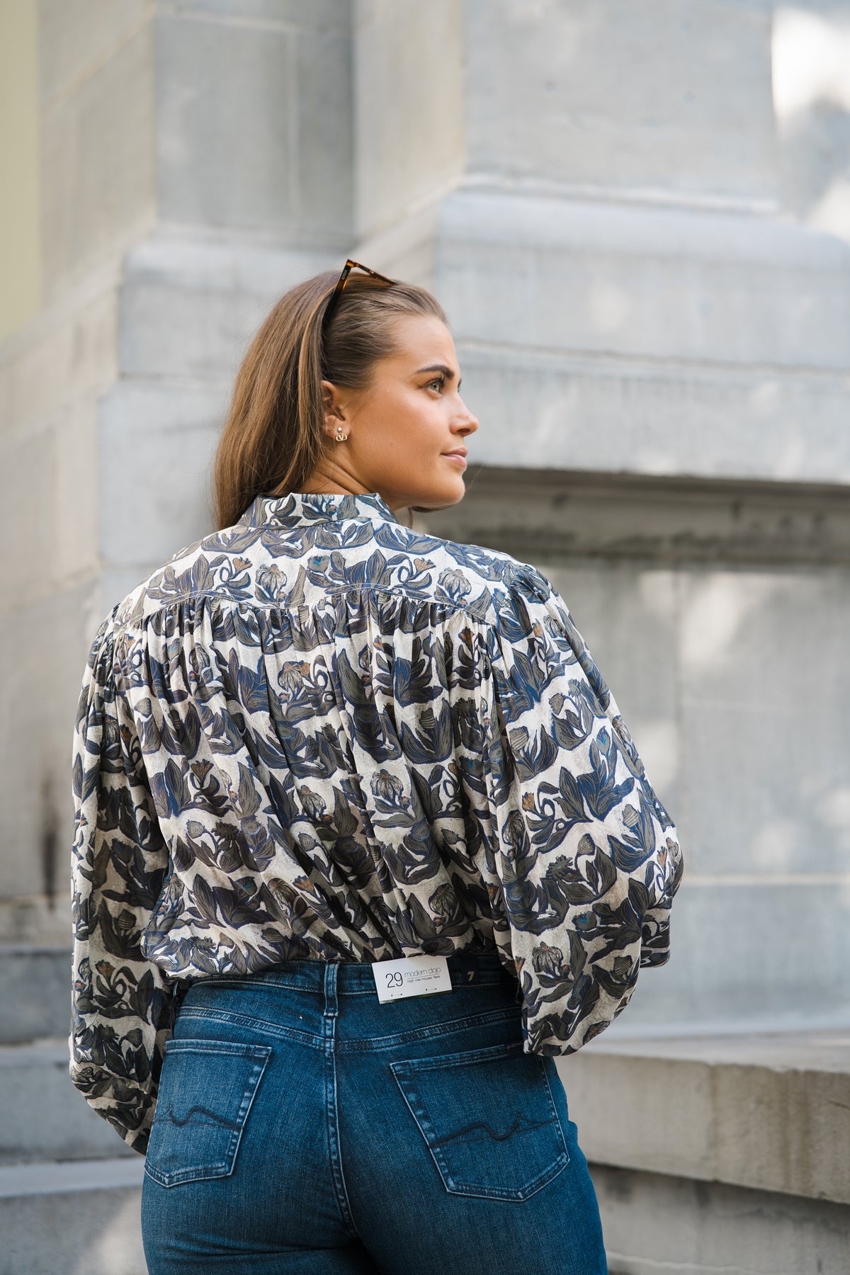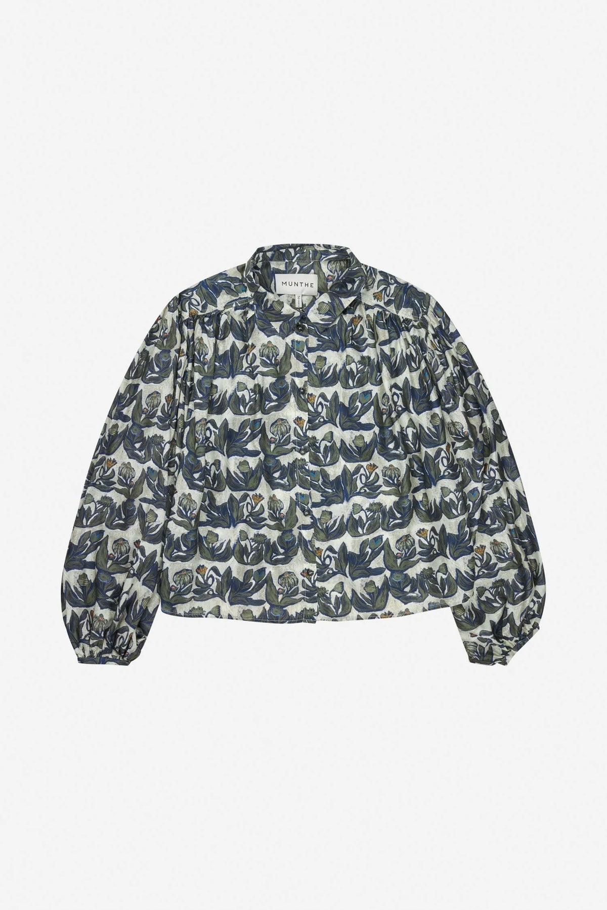 Lynx fra Munthe. Lynx er stilig bluse, i et lekkert mønster med blå- og grønne toner. Blusen er kortere i fasongen, med en behagelig a-fasong, klassisk krage, ballongermer og knapper i front. Blusen er lett og deilig i stoffet, og er perfekt til jeans.