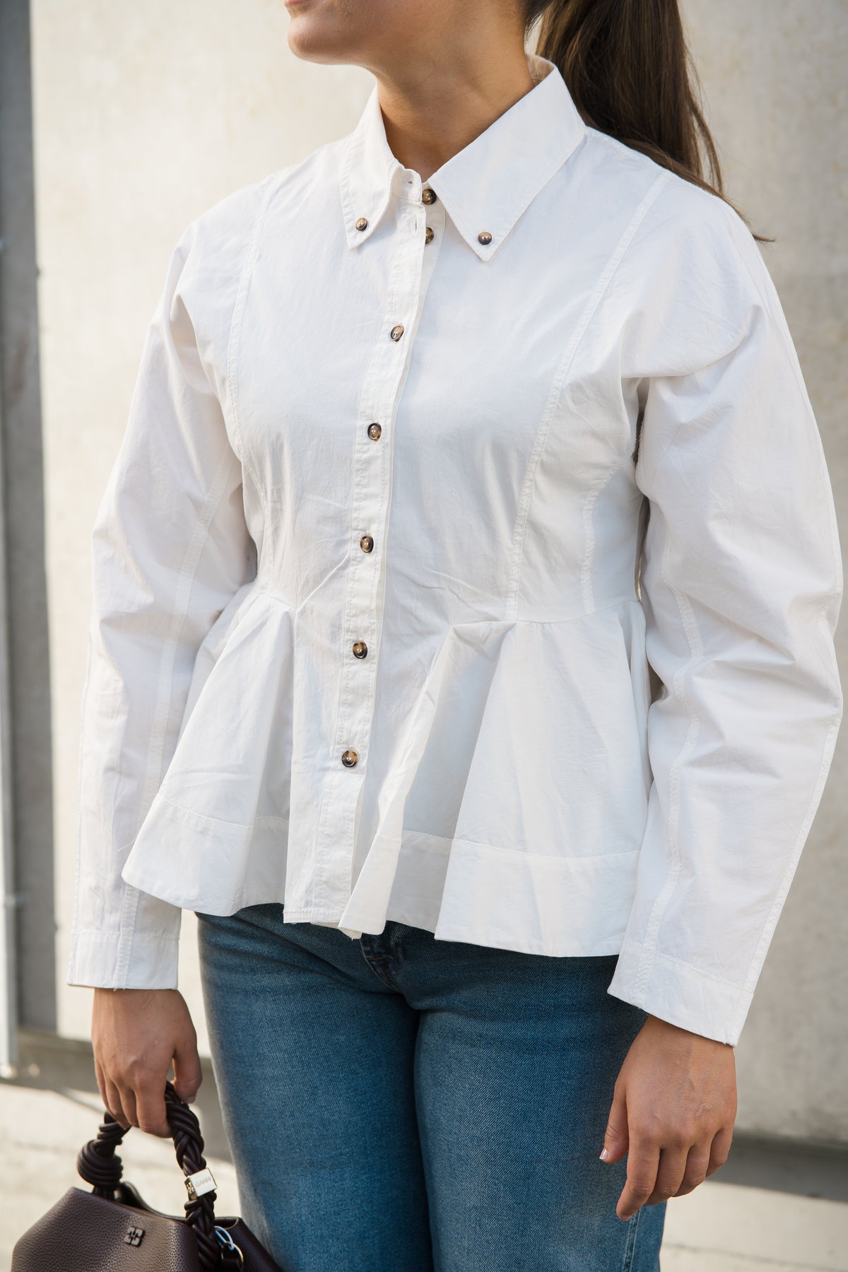 Stretch Cotton Peplum Shirt fra Ganni. En feminin skjorte med klassisk krage, knappestolpe foran og lange ermer med buet fasong. Den er innsvinget i midjen og har en peplum-detalj som gir en flatterende silhuett. Laget i myk bomullspoplin med en crisp, men behagelig følelse. En stilren og allsidig skjorte som passer både til hverdags og mer formelle anledninger.