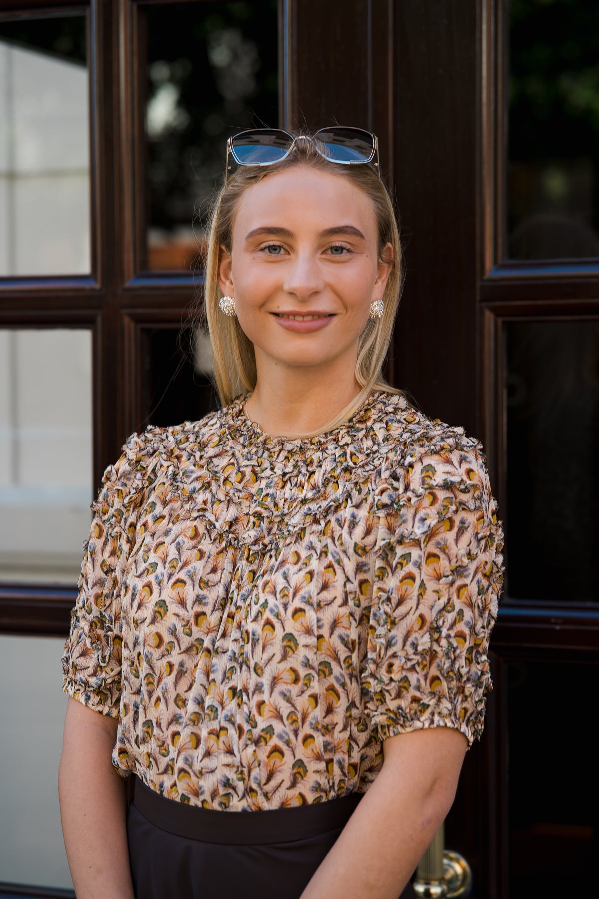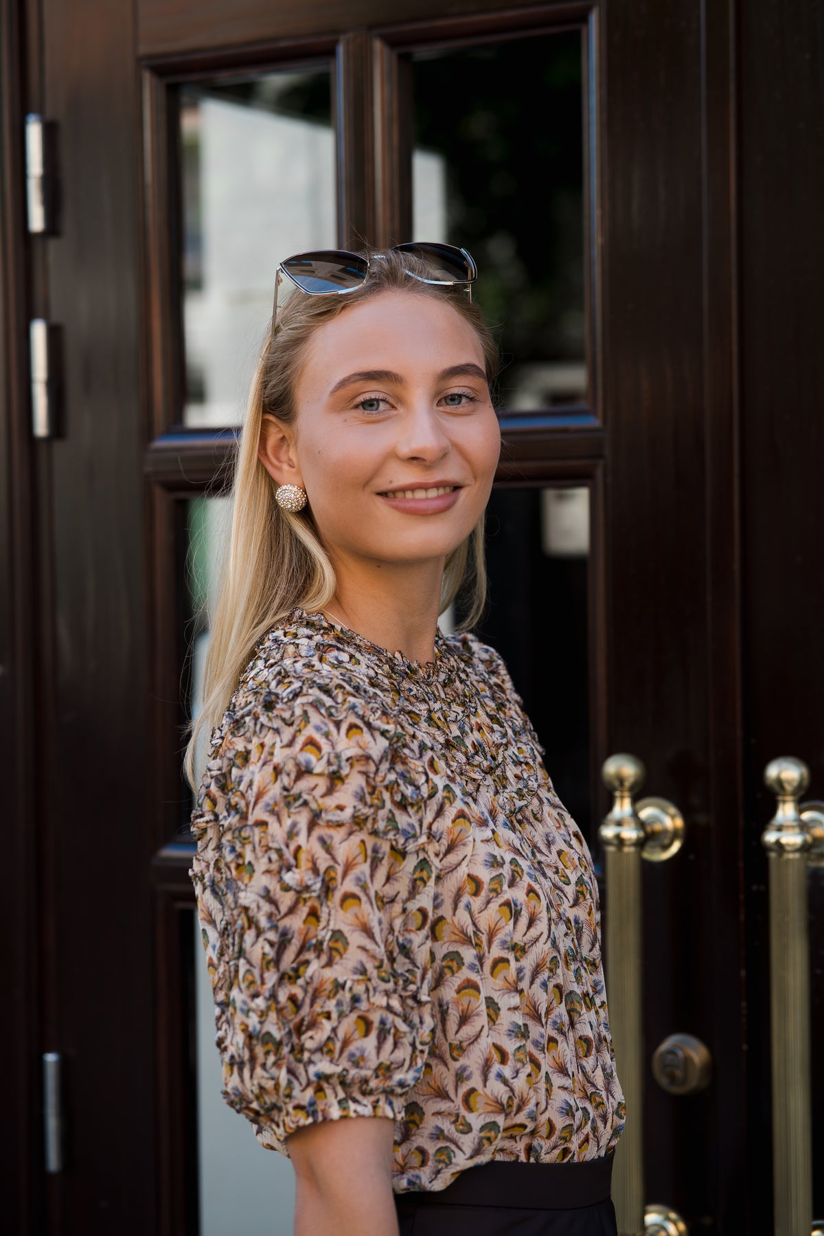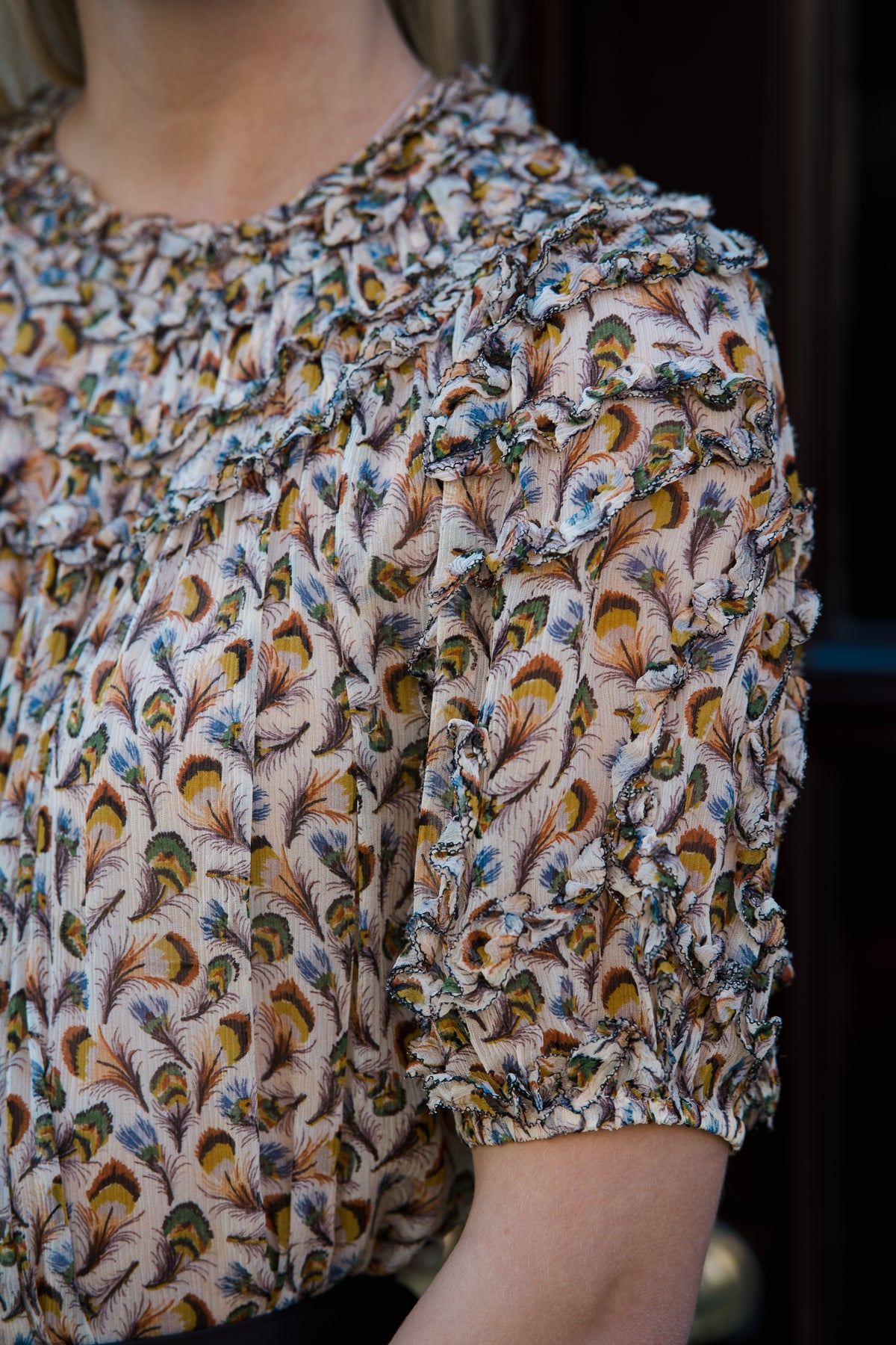Isolda Silk Smocked Short Sleeve Blouse fra Ulla Johnson. Bluse med delikate mikro-rysjer som virvler over bærestykket og ermene. Den er kuttet av hviskende lett krøllet chiffong og har et nydelig mønster. Blusen har en avslappet passform med korte ermer med elastiske mansjetter, rund hals og en skjult glidelås langs ryggen. Fin å style sammen med både bukse og skjørt.