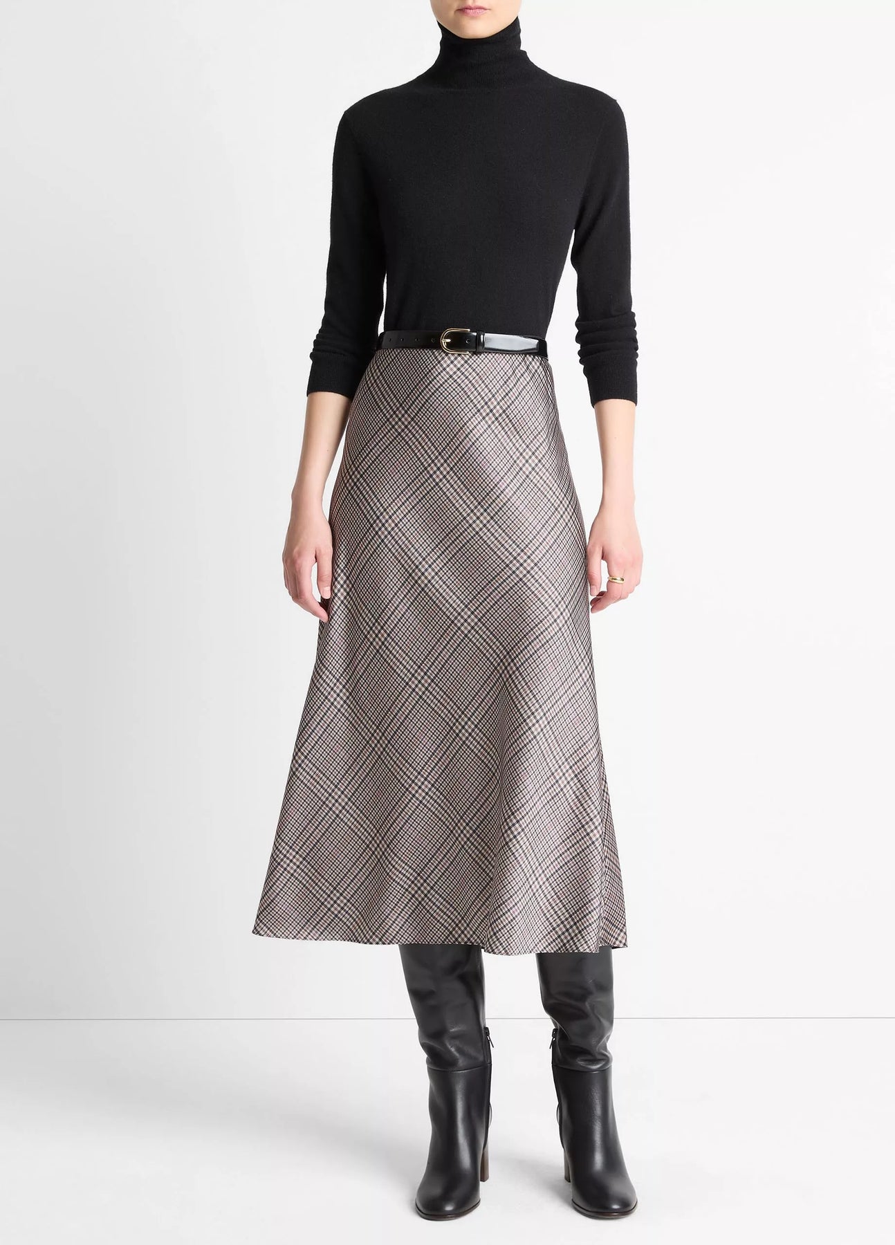 Denne slip-skjørtet henter inspirasjon fra vintagebiler, noe som gjenspeiles i det pressede rutemønsteret – en subtil referanse til de sporty interiørene. Det feminine uttrykket balanseres med mykere detaljer som skinnende satengstoff og en linning inspirert av delikate undertøysdetaljer.
