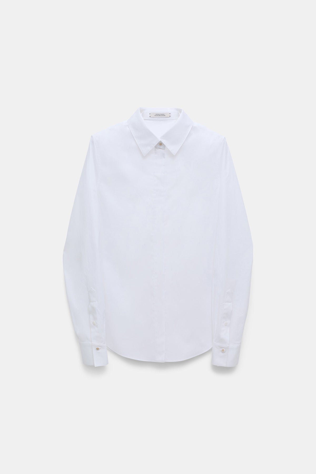 Blusen er laget av sprø bomullspoplin og har en figurnær passform som fremhever silhuetten. Det klassiske designet har D-rose-detaljer, en skjortekrage og en skjult knappestolpe for et rent og elegant uttrykk.