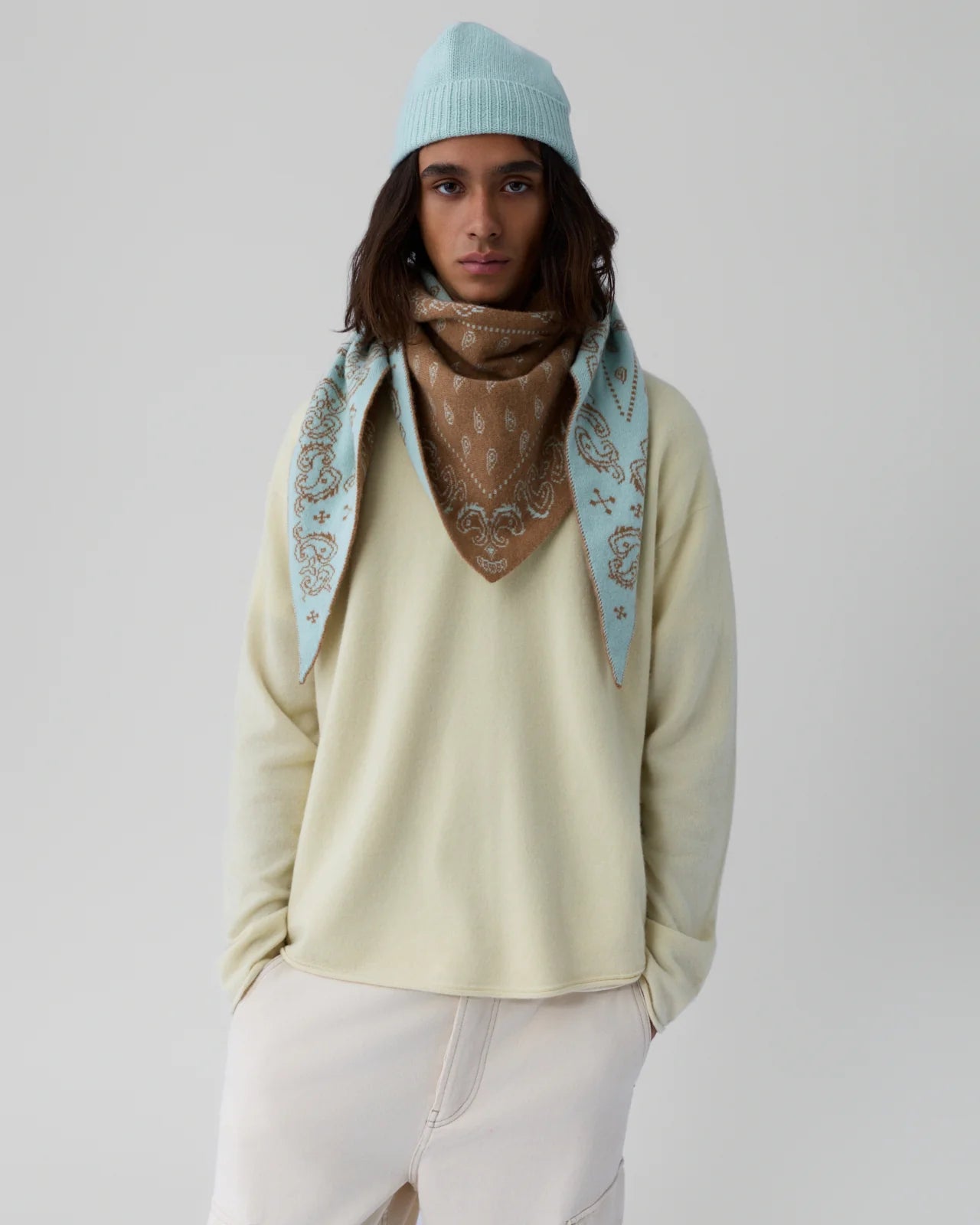 Sesongens hotteste tilbehør! Dette eksklusive skjerfet fra Guest in Residence er en moderne tolkning av den klassiske bandanaen, designet for deg som verdsetter både luksus og tidløs stil. Skjerfet er laget i deilig, myk, 100% kashmir. Skjerfet er tosidig, med almond og seaglass på den ene siden, og seaglass og almond på den andre siden. Perfekt å style til skjorter, strikk eller utenpå kåpen.
