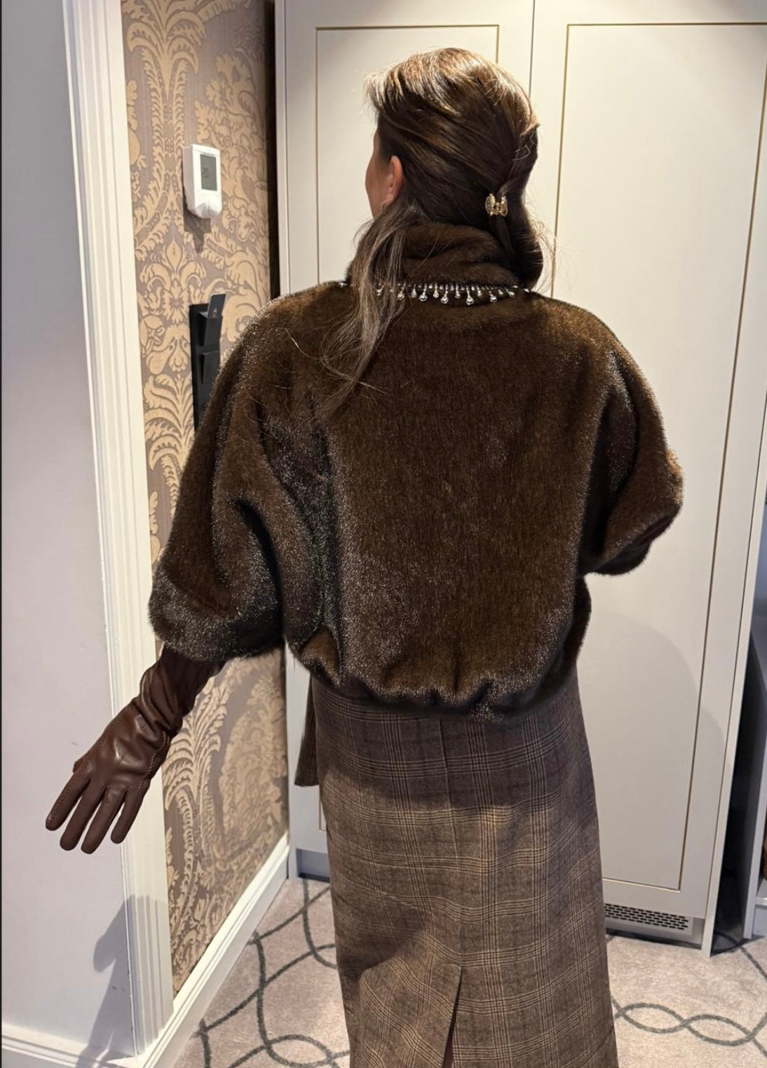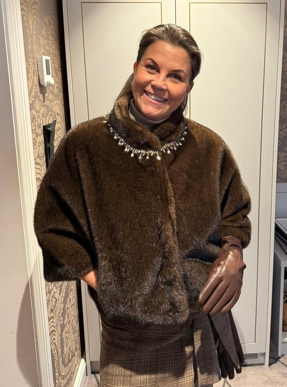 Denne fuskepels jakken er helt nydelig! Det er en krysning mellom jakke og vest, med trekvart ærmer. Denne passer perfekt over juleantrekket eller et ellers pyntet antrekk. Og om du har korte ærmer på antrekket under kan du style denne med lange hansker.