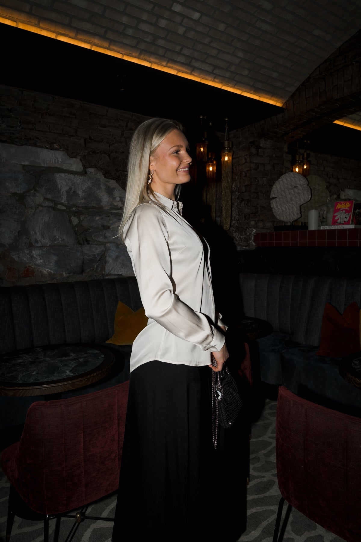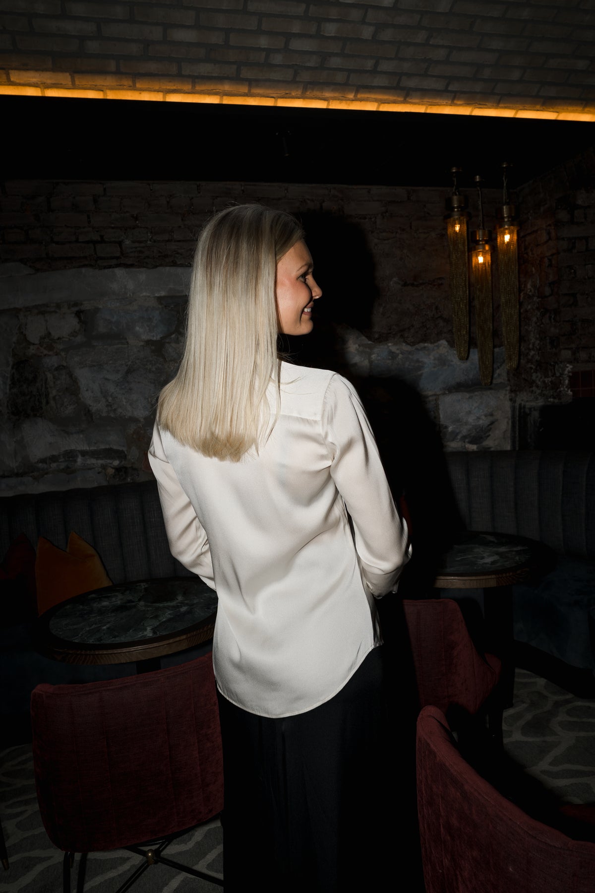 Skjorten er laget av silke og har en feminin passform. Skjorten har skjulte knapper, enkle mansjetter og en klassisk krage.