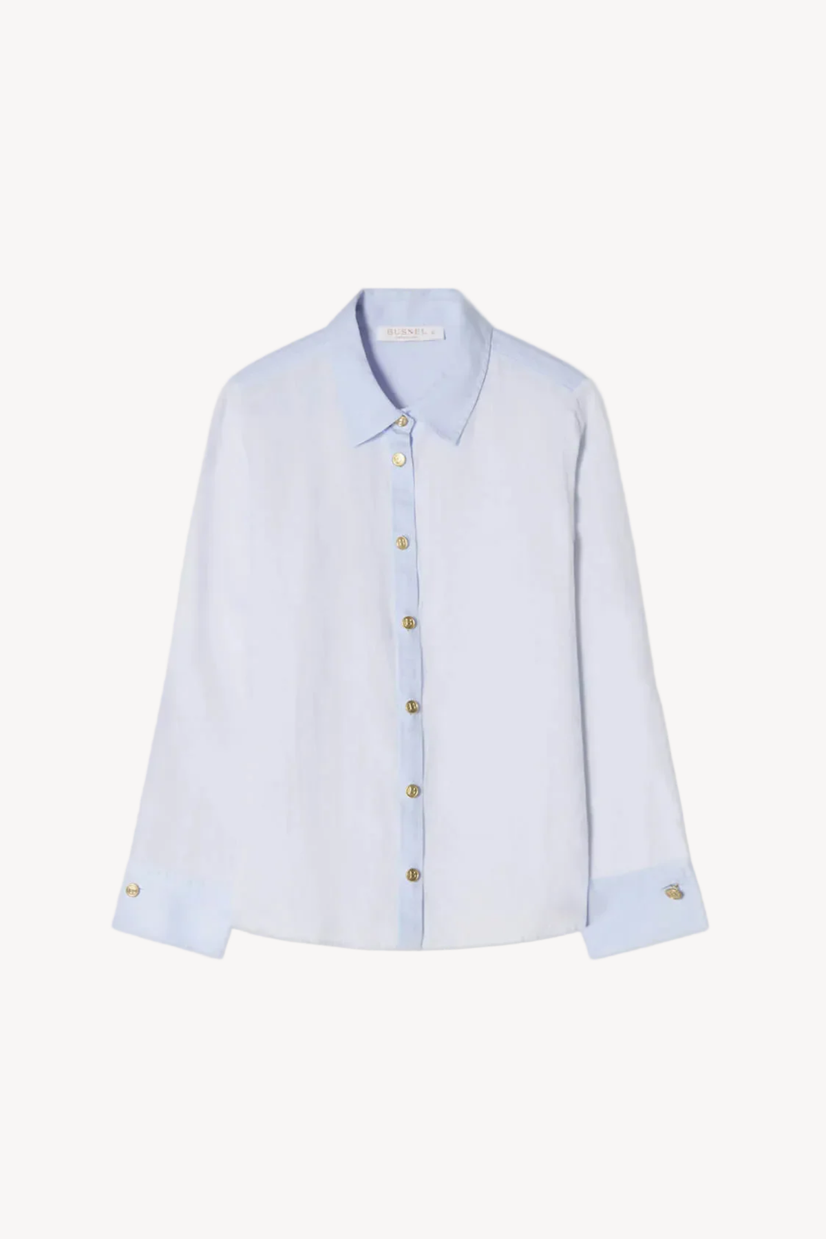 Blusen er sydd i 100 % lin som føles luftig mot huden og faller vakkert på kroppen. Krage og brede mansjetter i glansfull bomull skaper en raffinert kontrast til den matte linstrukturen, mens Busnels ikoniske gullknapper langs den gjennomgående knappestolpen tilfører et eksklusivt preg. Den rette, tidløse silhuetten gjør den enkel å style. Bruk den kneppet til dressbukser eller skjørt for et polert uttrykk, eller la den stå åpen over en topp for en mer avslappet, men gjennomført look. En allsidig linbluse som løfter både hverdagsantrekk og mer formelle kombinasjoner.