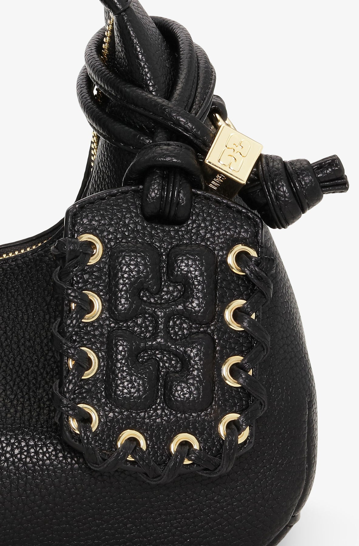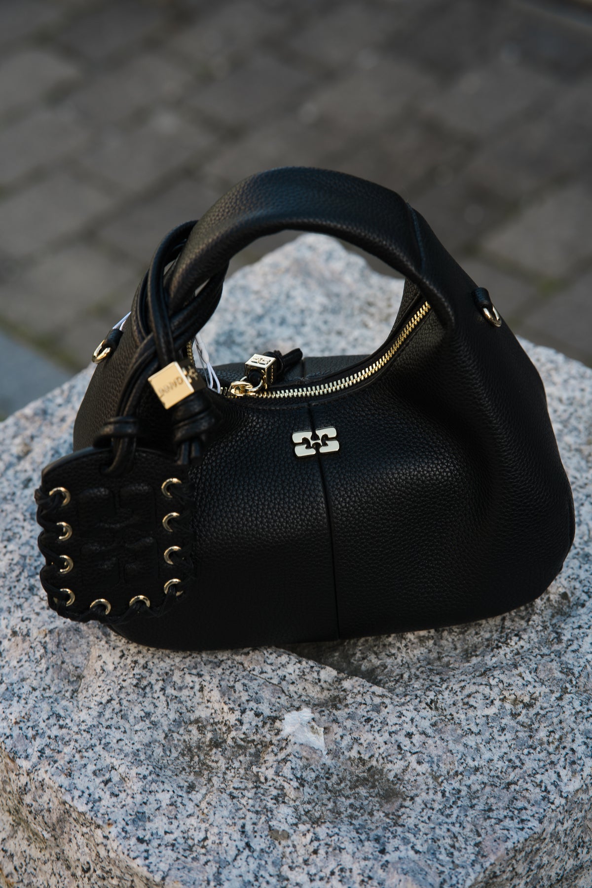 Hobo Mini Grained fra Ganni. Denne vesken har topphåndtak, justerbar og avtakbar stropp og glidelåslukking. Vesken har en merkelapp med speil og en innvendig lomme. Perfekt til hverdagsbruk og til finere anledninger.