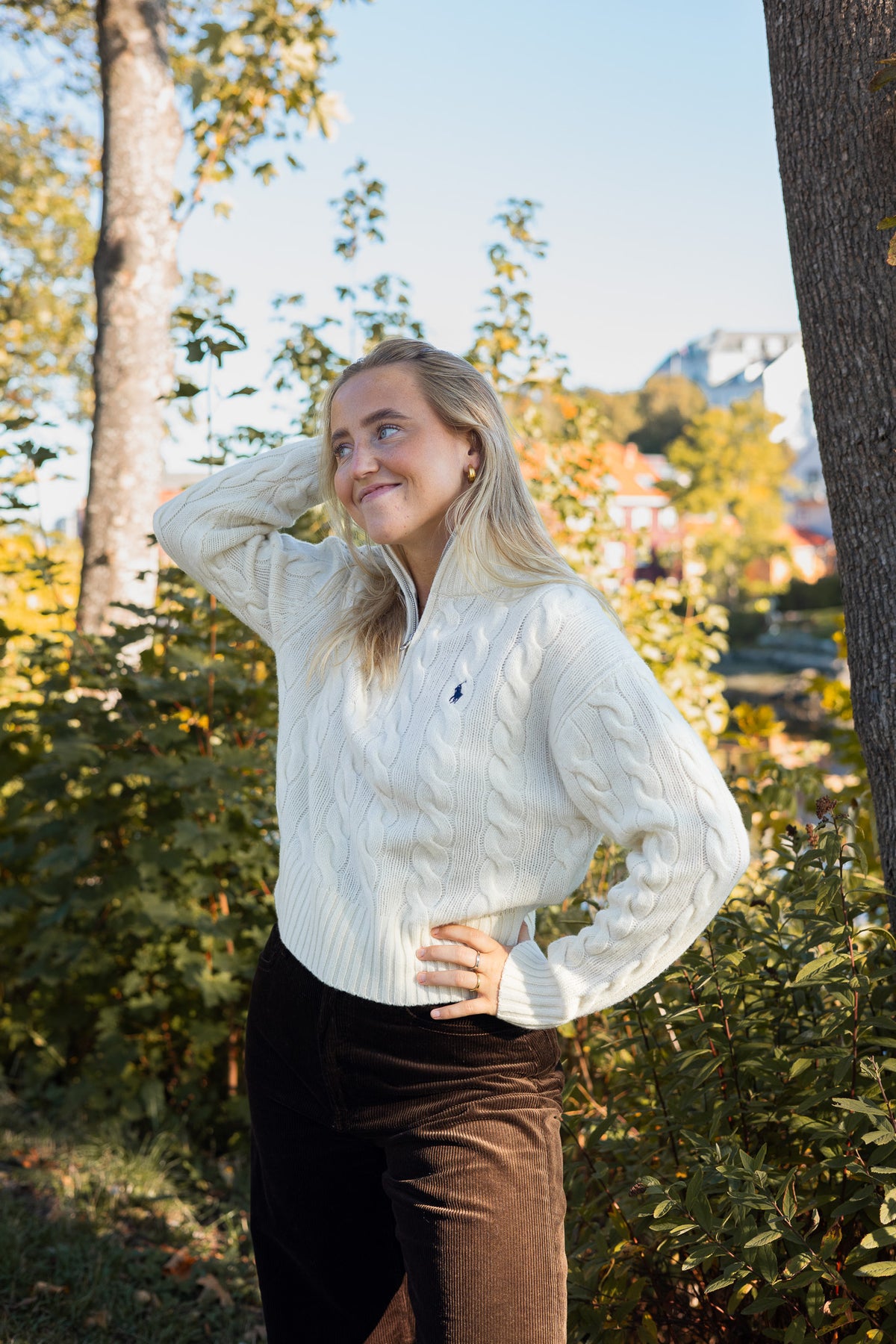 Sweater-Pullover fra Polo Ralph Lauren. En nydelig kabelstrikket genser i italiensk ull og cashmere, som gir en myk og grov tekstur. Genseren har en avslappet passform med høy hals og half-zip, med den signaturbroderte ponny-logoen på brystet.