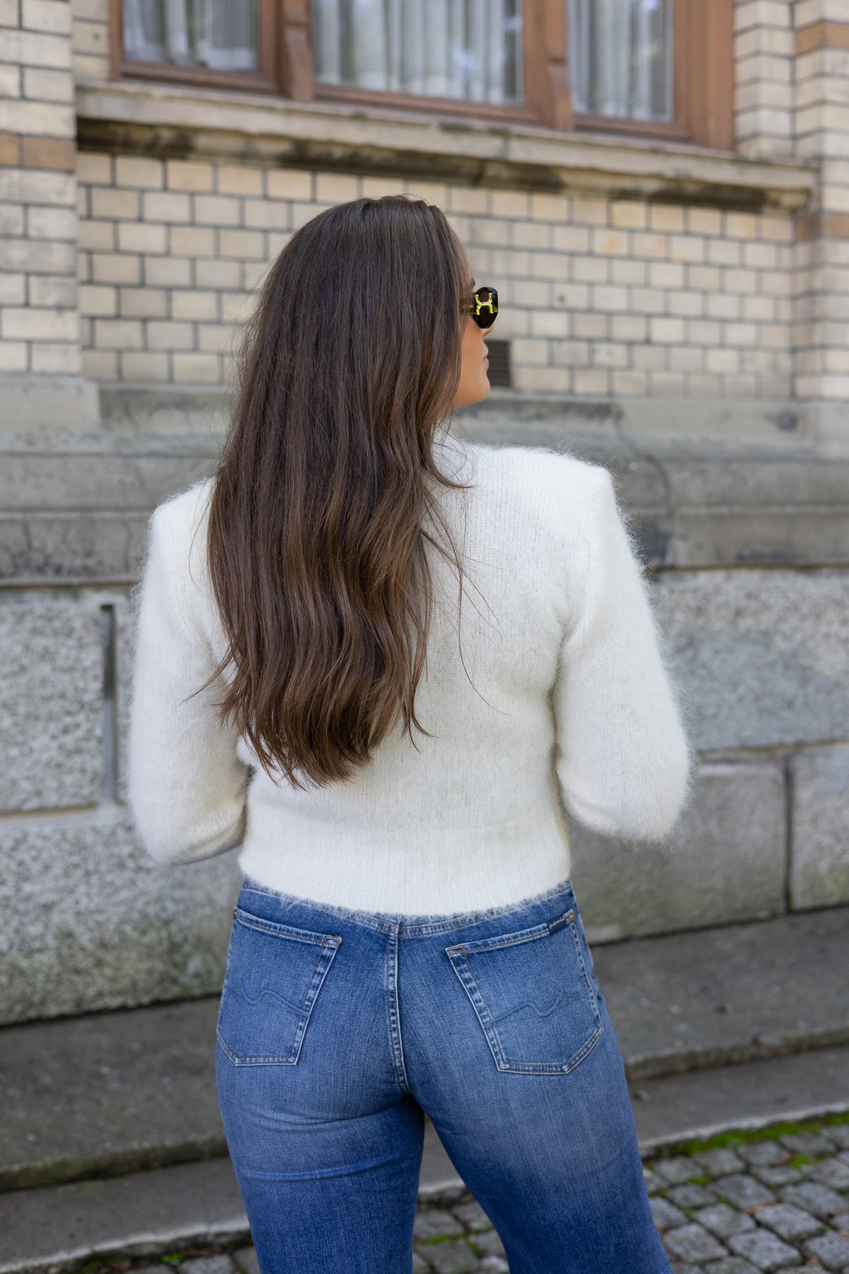 Hair Knit Fitted Sweater fra byTiMo. Denne genseren er laget av byTiMos veldig myke og luftige blanding av RAS-sertifiserte garn. Genseren har en kort, tettsittende kant, lange ermer, skulderputer og en rund hals. Mansjettene, halsen og kanten har vakre ribbedetaljer.