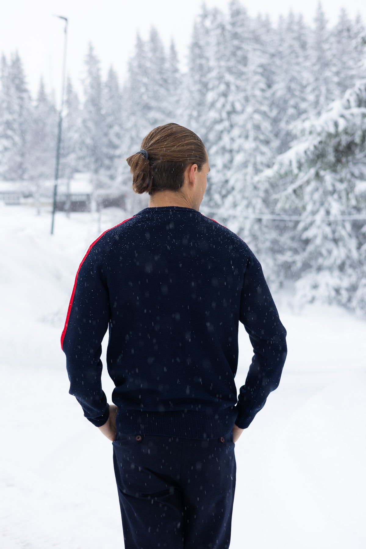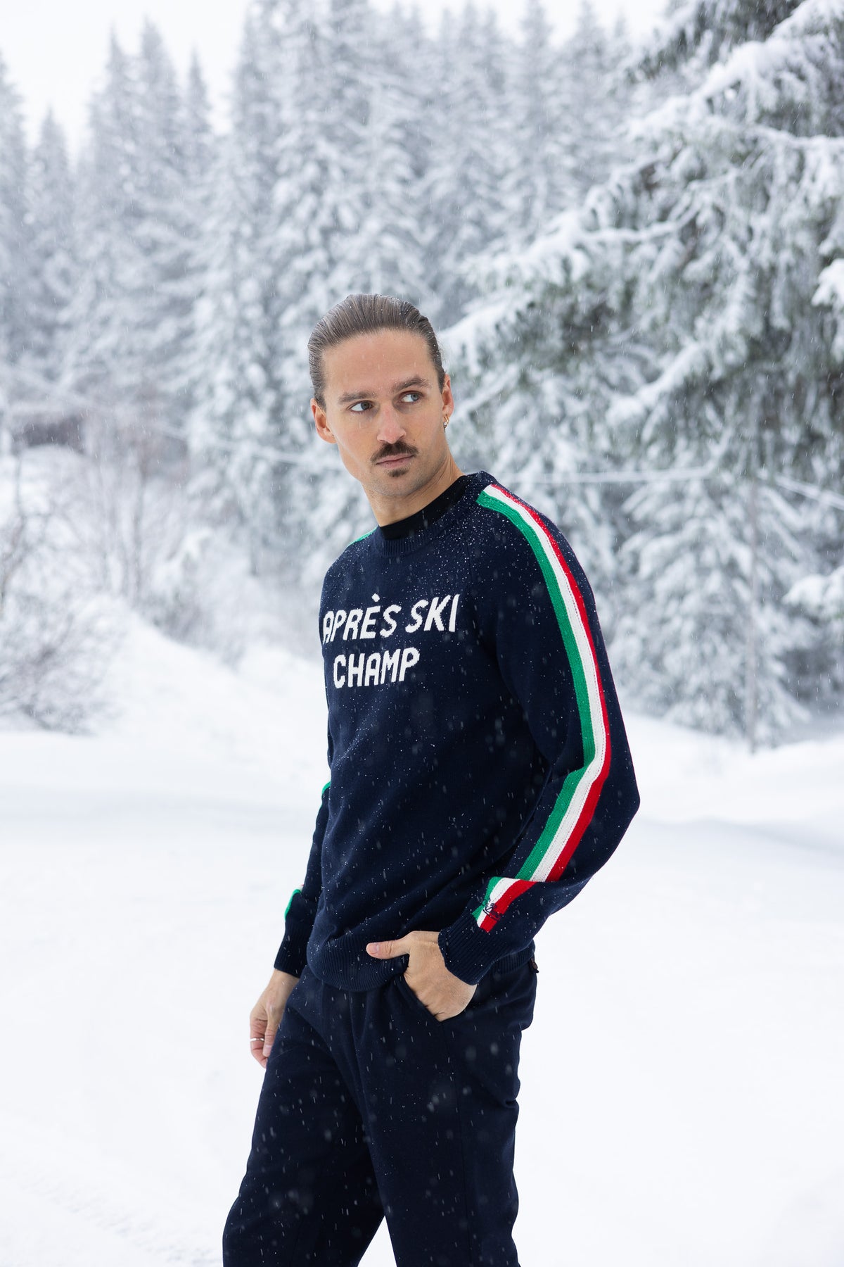 Heron Ski Apres Ski Champ 61 fra MC2 Saint Barth. En stilig strikkegenser med rund hals, mansjetter og en normal passform. Genseren har et stilig motiv med teksten "Après Ski Champ" foran, og striper i ulike farger langs ermene. Enten du skal tilbringe dagen på ski, eller om du skal kose deg på afterski, så er denne genseren det perfekte valget.