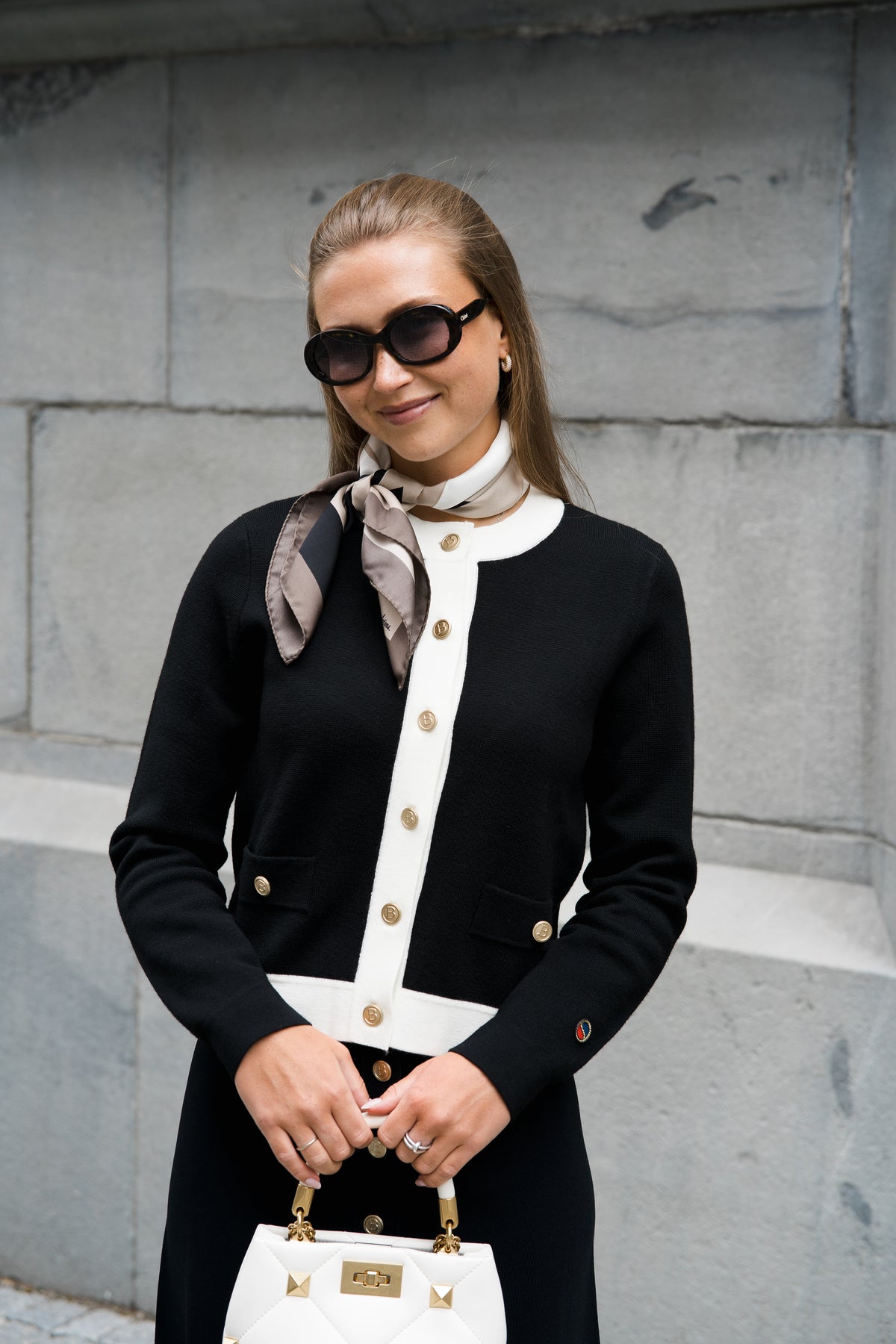 Aria Cardigan Contra fra Busnel. En elegant strikkejakke i 100% ull. Den sorte basen kombineres med kontrastdetaljer i ecru, som gir et eksklusivt og tidløst uttrykk. Den lukkes med B-knapper foran, har rund hals og lomme-detaljer foran.
