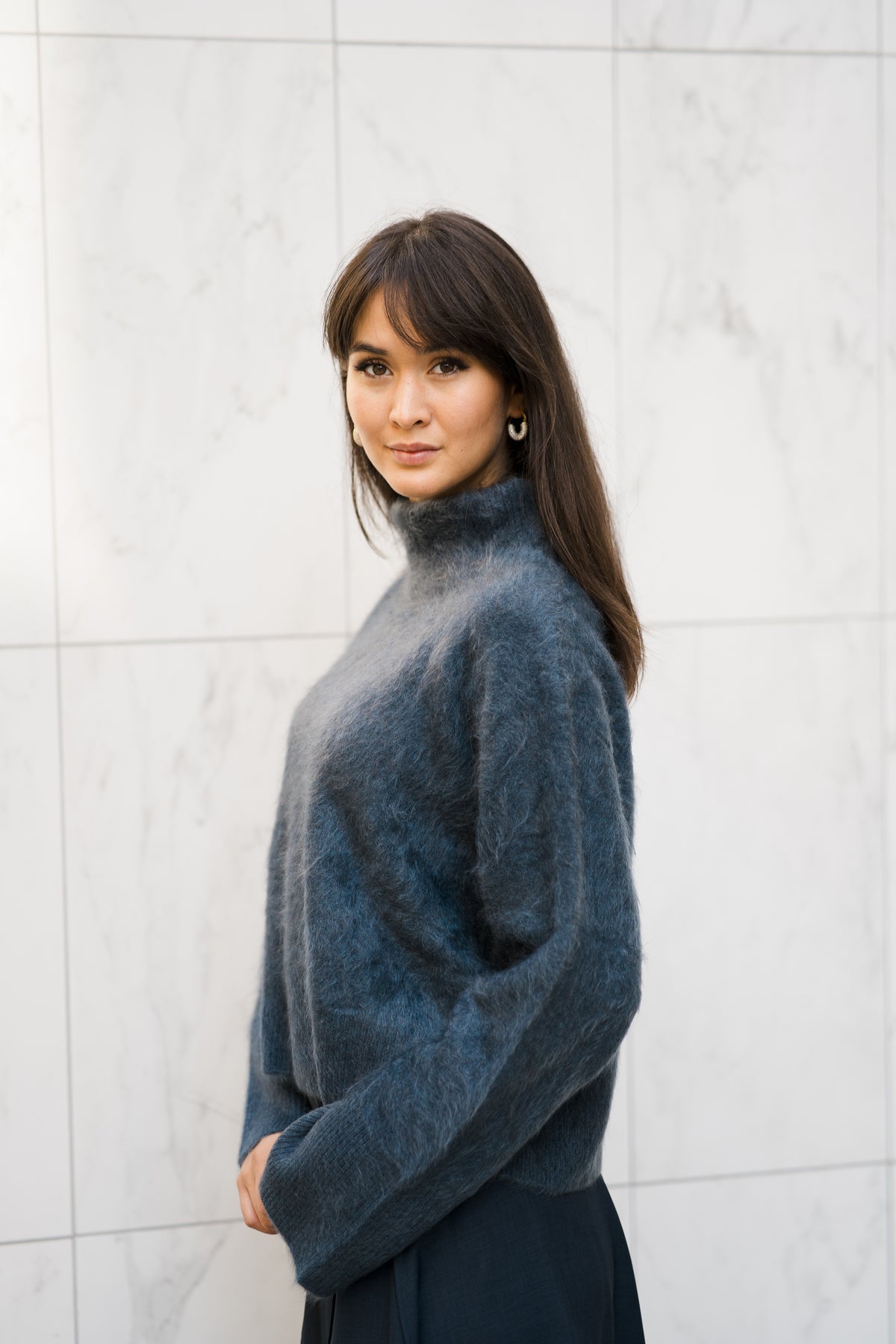 Floren Sweater fra Lisa Yang. Denne luksuriøse genseren har høy hals, laget av kraftig strikket børstet cashmere med en myk tekstur. Genseren har en normal passform, senkede skuldre og vide lange ermer. Perfekt å style sammen med både bukse og skjørt.