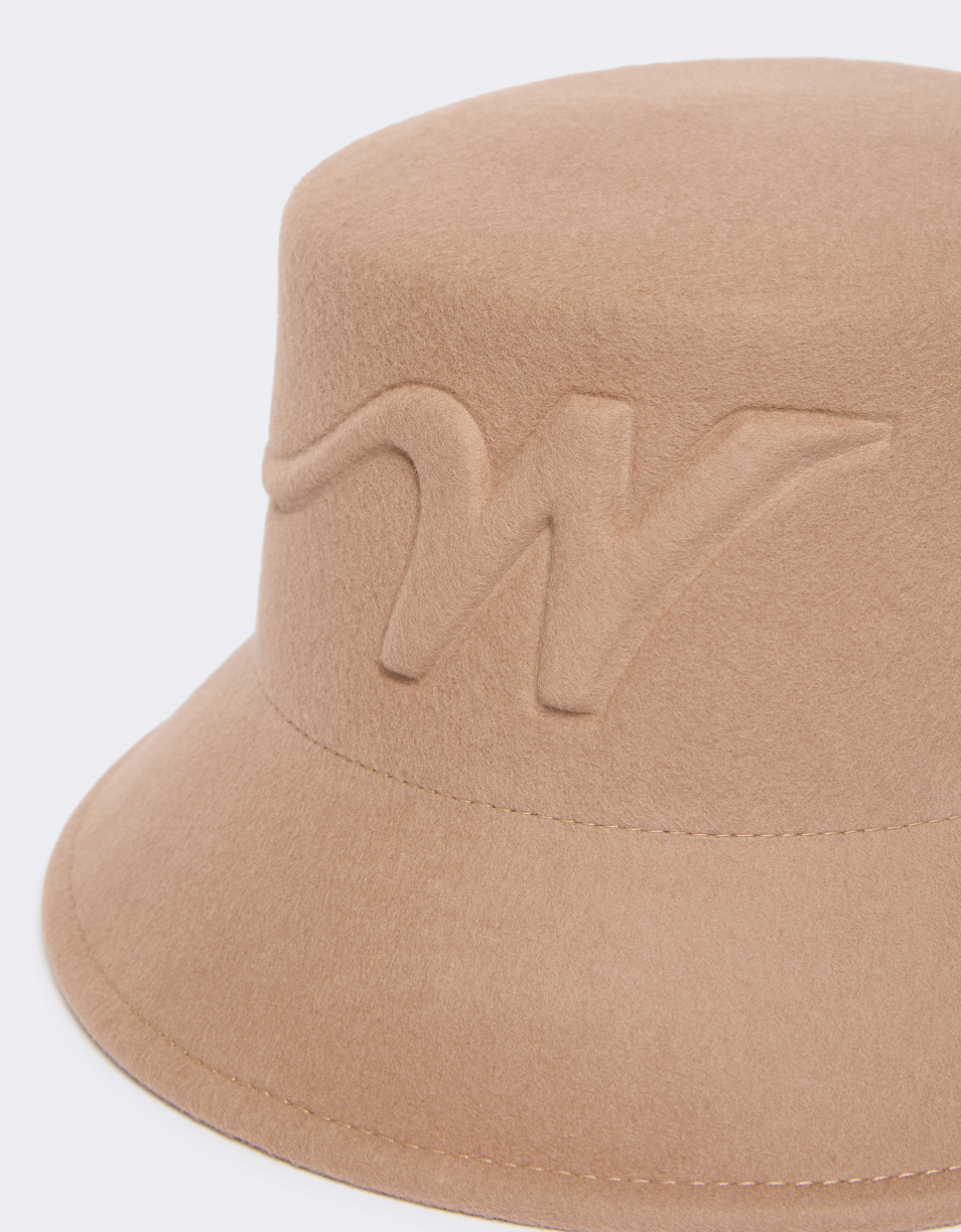 Yaqui fra Max Mara Weekend. En bøttehatt som er laget i 100% ull, og en innvendig kant i bomullsbånd. Bøttehatten har en stor logo foran.
