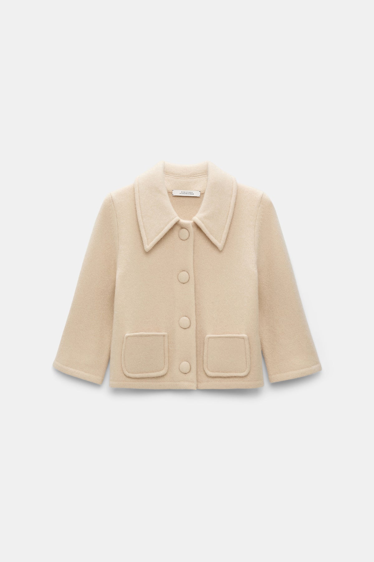Modern statement jacket fra Dorothee Schumacher. En nett, liten jakke i merinoull og cashmere. Denne elegante jakken har en klassisk krage, knapper hele veien i front og to små, søte lommer foran. Jakken har tre kvart lange ermer. Bruk den gjerne med det lekre skjørtet, eller kombiner den med dine favoritt bukser.