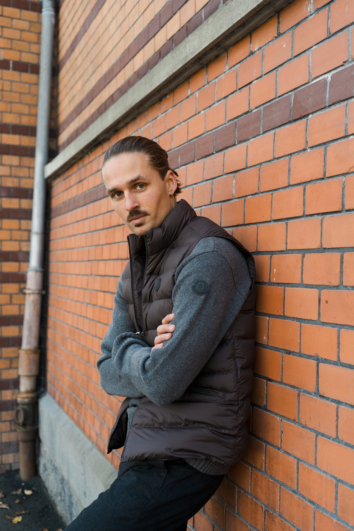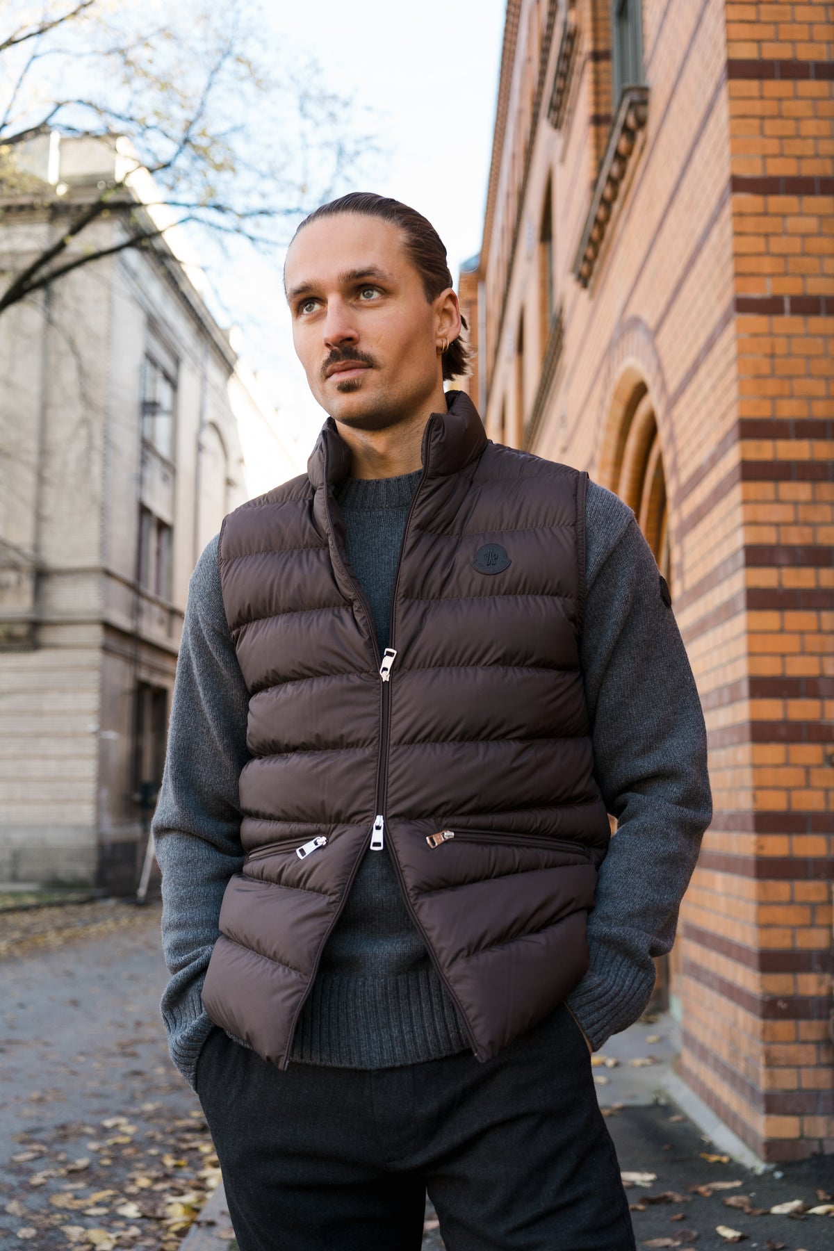 Treompan kombinerer en klassisk silhuett med allsidighet, og passer like godt på kontoret som på utendørsaktiviteter i helgen. Vesten er laget i Airsoft, et lett og slitesterkt nylonmateriale med vannavvisende finish, og er fylt med dun for optimal varme. Den har krage med trykknapp, glidelåslukking, glidelåslommer og en diskret Moncler-logo i skinn som en elegant signatur.