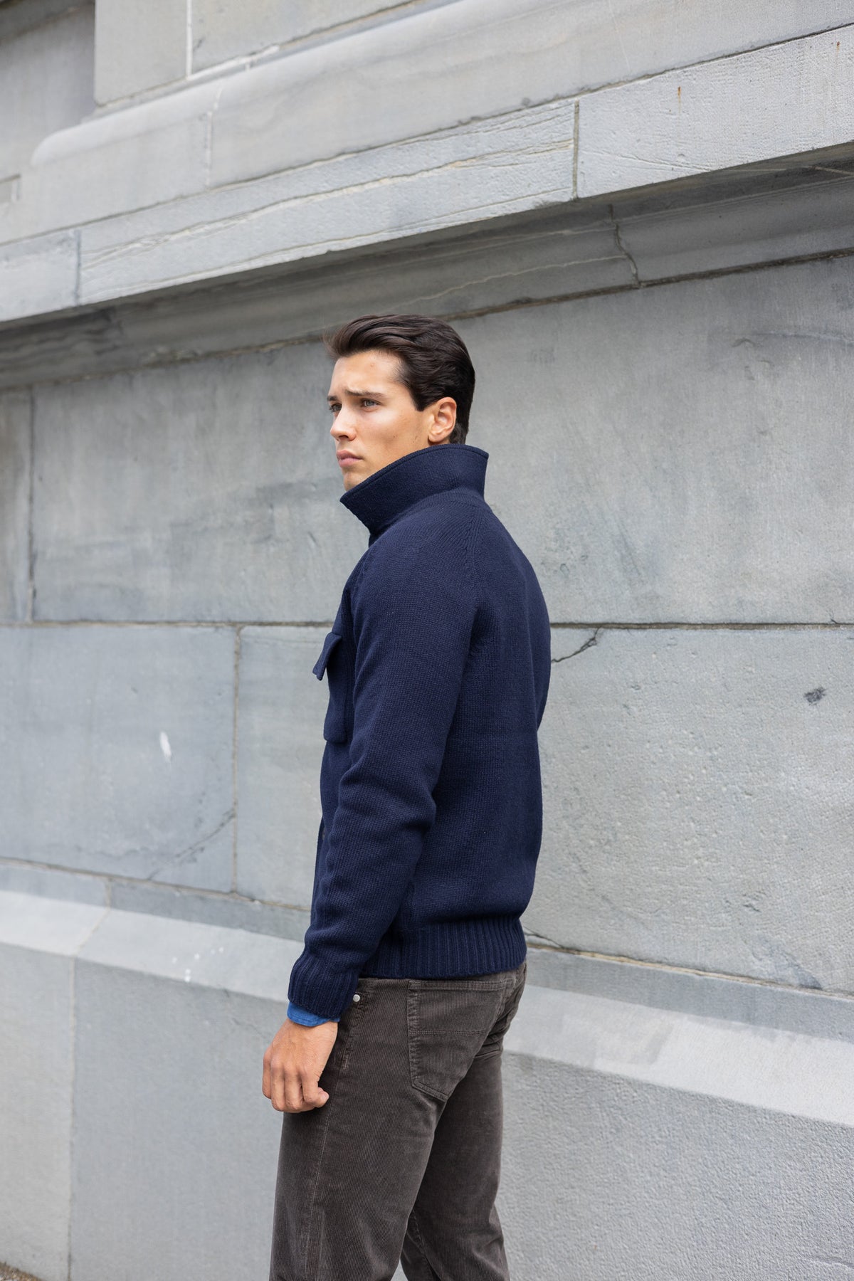 Overshirten er preget av rene linjer, to brystlommer med klaff og knapp som tilhører både stil og funksjon. Knappelukkingen i front gjør den enkel å tilpasse etter anledning, mens ribbestrikkede mansjetter og fals gir plagget en struktur og flatterende silhuett.