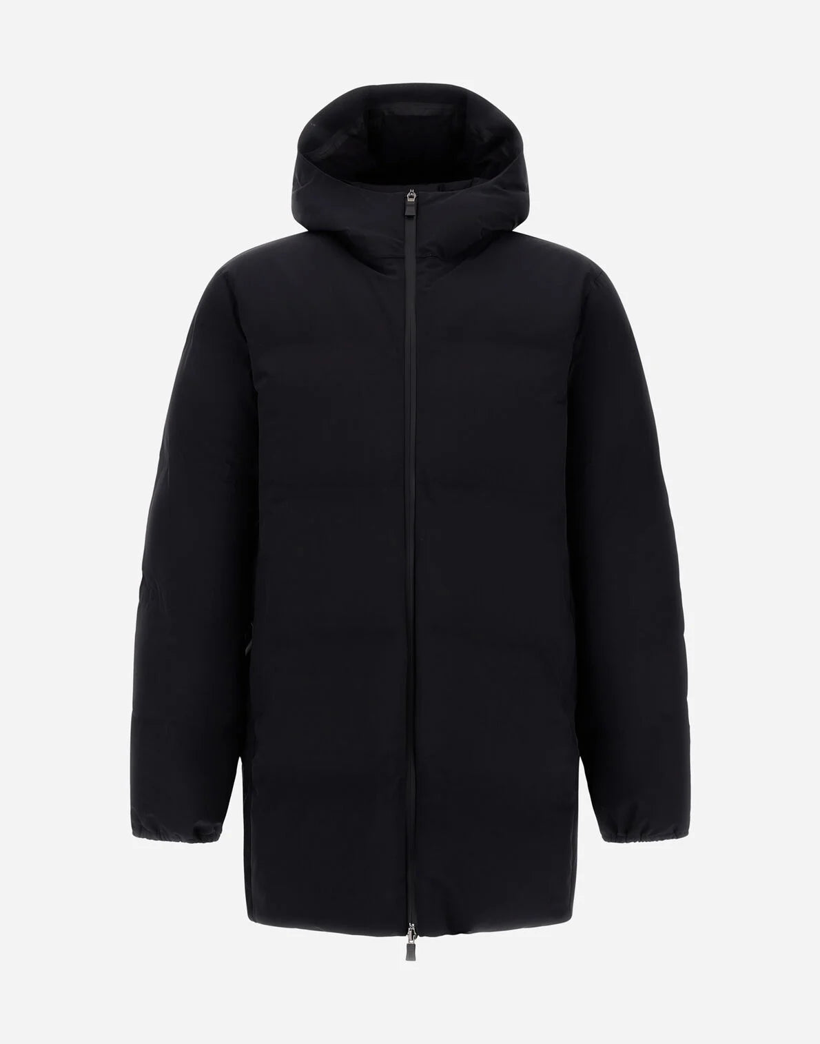 Denne lange jakken er laget i et matt 4-veis stretchmateriale med en myk og behagelig følelse. Stoffet er kombinert med en elastisk membran og fullstendig varmeforseglet, noe som gjør jakken sømløs, vanntett, vindtett og pustende. Med sitt minimalistiske uttrykk og gjennomførte detaljer har den et smart design med høy krage, hette og toveis glidelås som gir fleksibel passform. Jakken har normal passform, stripet vattering med fjærfyll, sidelommer og Herno-logo på ryggen.