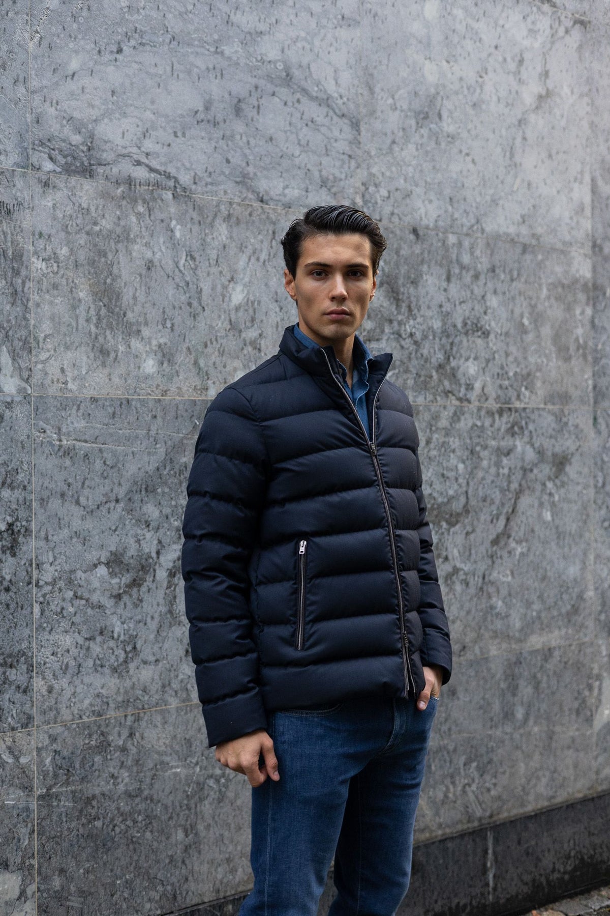 Denne bomberjakken er laget i en teknisk blanding av ull og polyester med en glatt overflate og en elegant glans. Med inspirasjon fra klassisk casual wear og et skreddersydd detaljnivå, er dette et tidløst plagg som passer til enhver anledning. Jakken har normal passform, stripet vattering med fjærfyll, høy krage, sidelommer med glidelås, toveis glidelåslukking og metallfarget Herno-logo på ryggen. Laget i Italia.