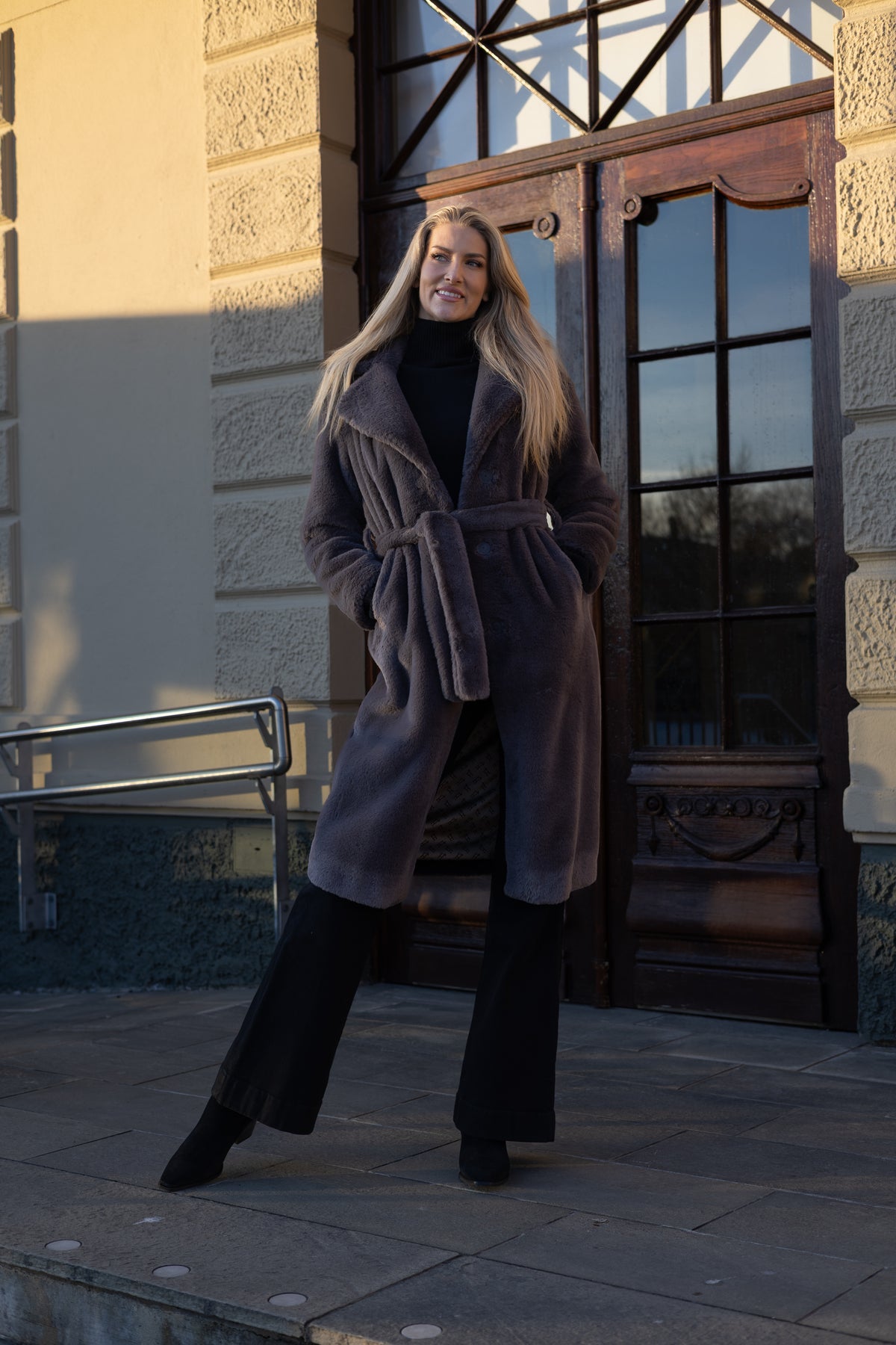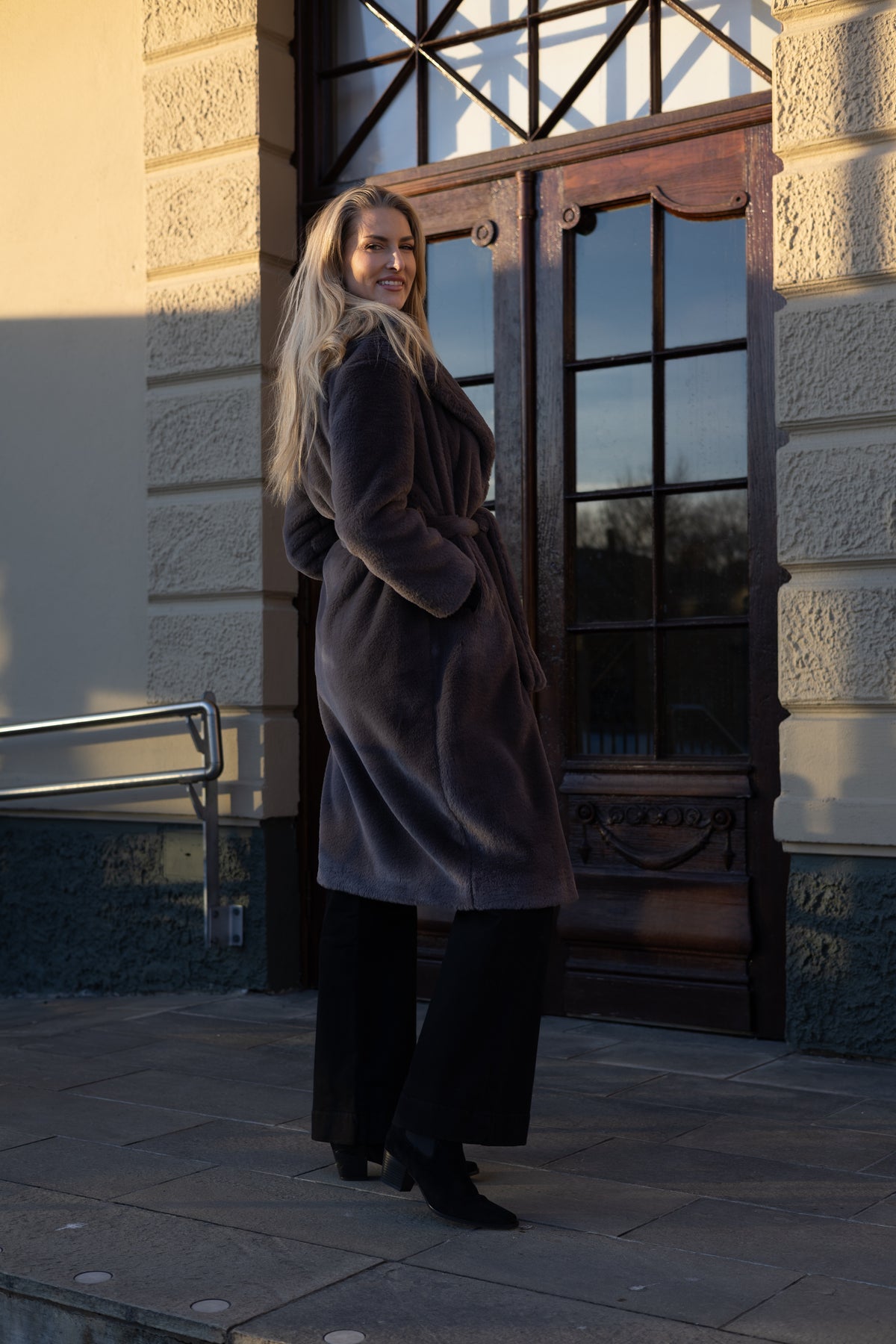 Denne kåpen er laget i ekstra myk fuskepels, og kombinerer komfort med et sofistikert uttrykk. Den passer perfekt både til spesielle anledninger og mer uformelle situasjoner. Kragen beskytter mot kulde, og med belte i livet kan du velge om du vil bære kåpen åpen eller innsvingt for en mer definert silhuett. Fôret er nydelig dekt med merket sin gjenkjennbare H.