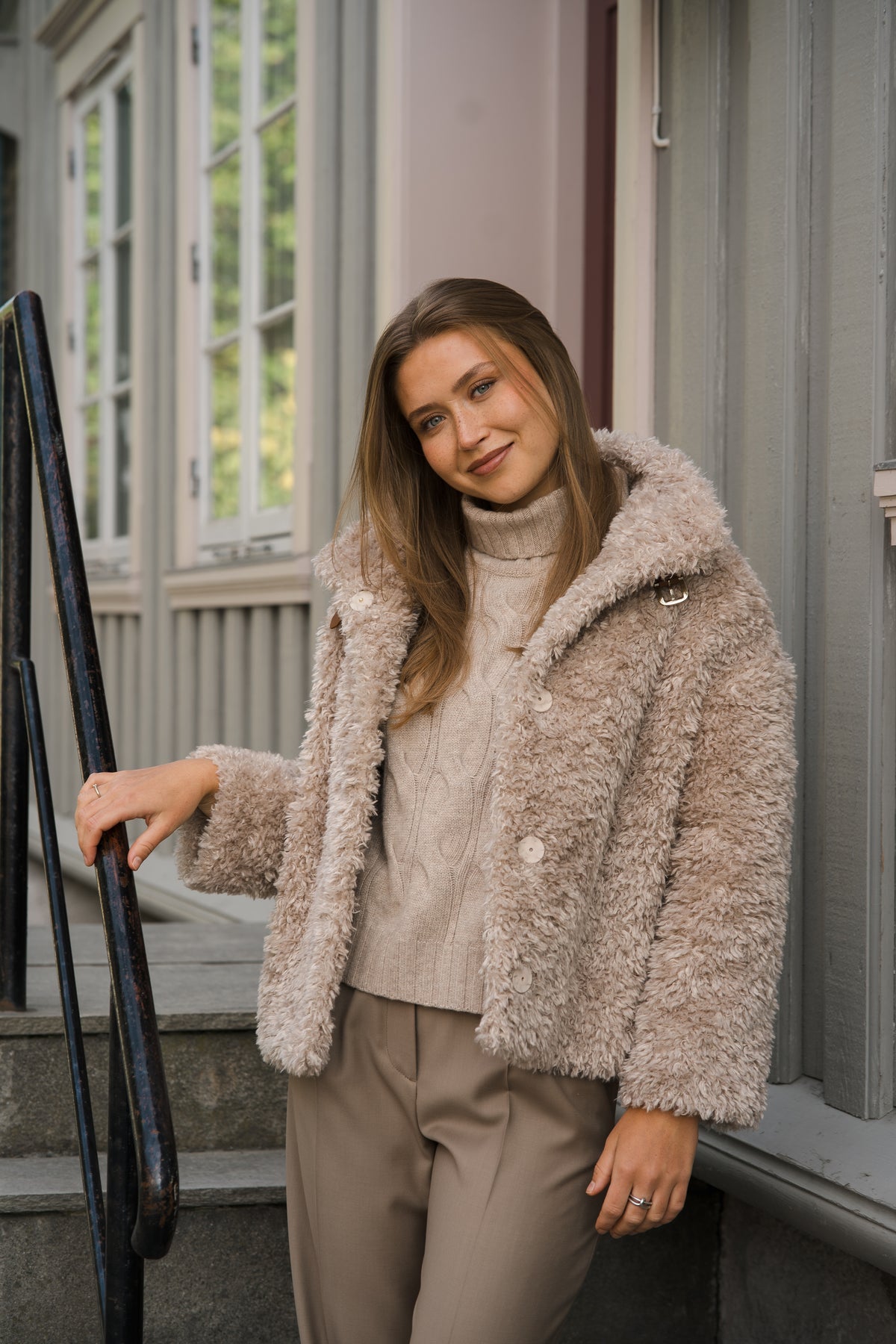 Denne capen er laget i myk og behagelig fuskepels med en krøllet shearling-effekt. Den har en sofistikert silhuett med justerbar lærreim i halsen og er helfôret med et eksklusivt jacquardfôr med Herno-logo. Modellen har høy hals, sidelommer og lukkes med trykknapper. En luksuriøs oppdatering til hverdagsgarderoben.