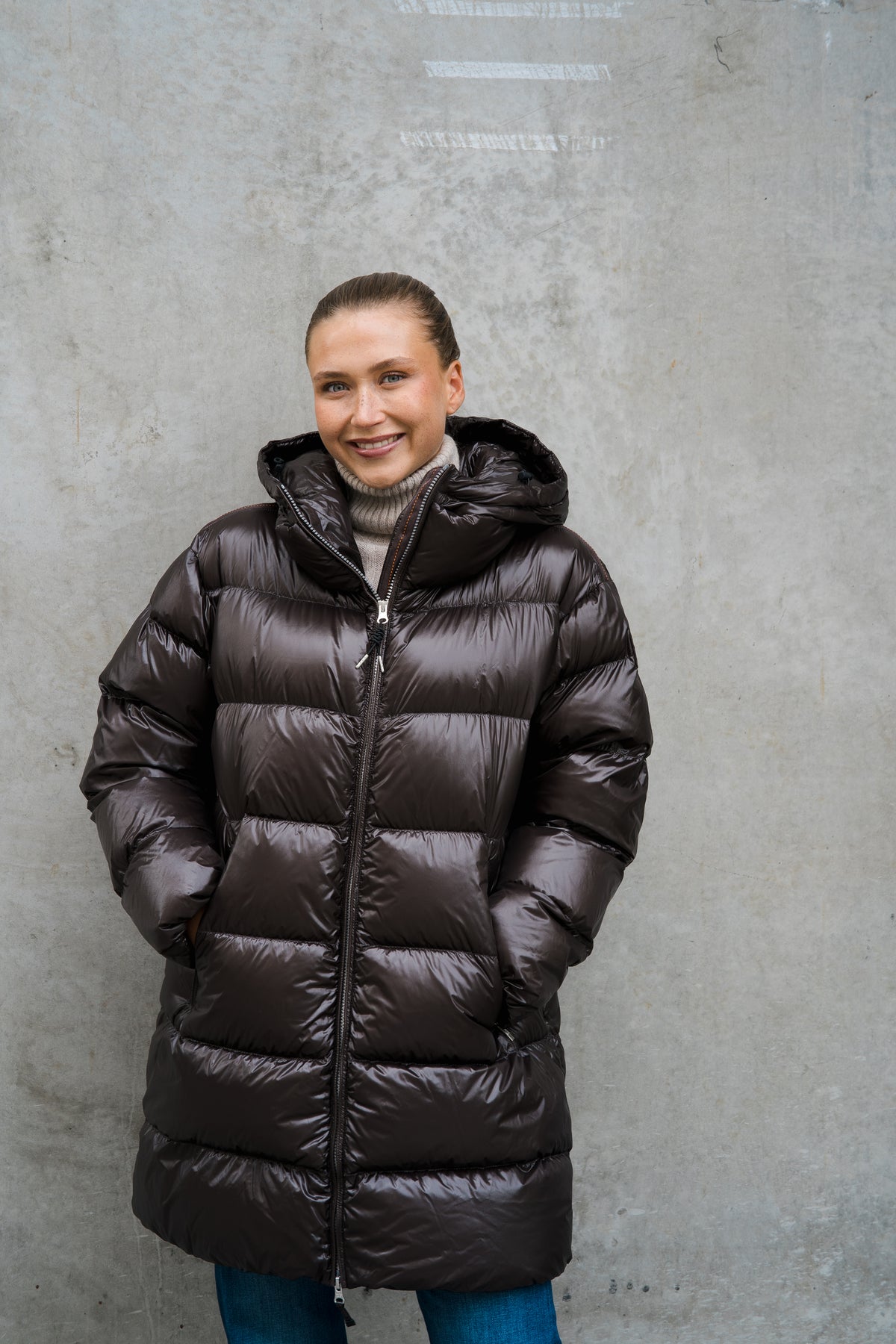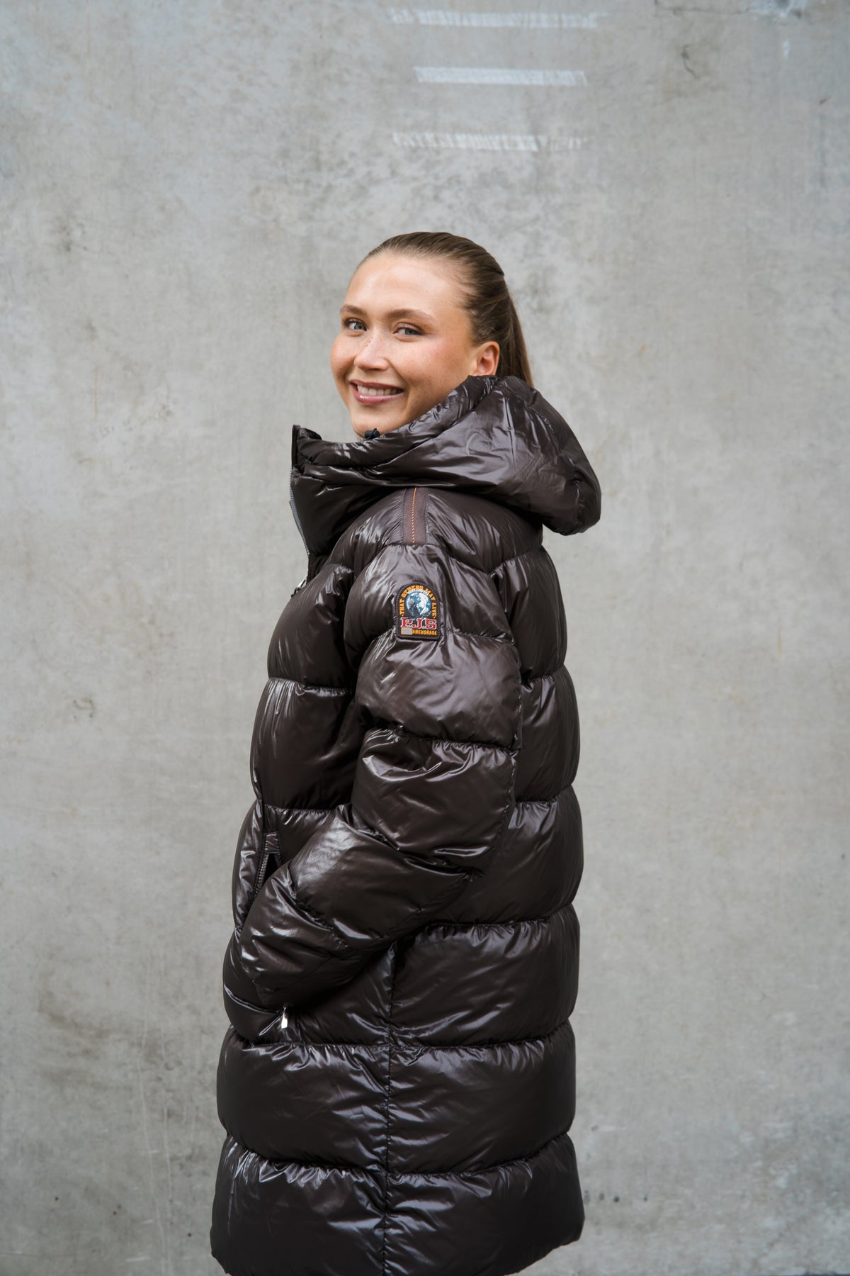 Ivonne fra Parajumpers. En lett lett vinterjakke som kombinerer funksjonalitet med moderne stil. Jakken er vattert med 100% andedun for optimal varme uten ekstra vekt, og har yttermateriale i ultralett, skinnende nylontaft med vannavvisende behandling. Praktiske detaljer inkludert toveis-glidelåslukking, hette, to glidelåslommer, elastiske mansjetter og snøring nederst for justerbar passform.