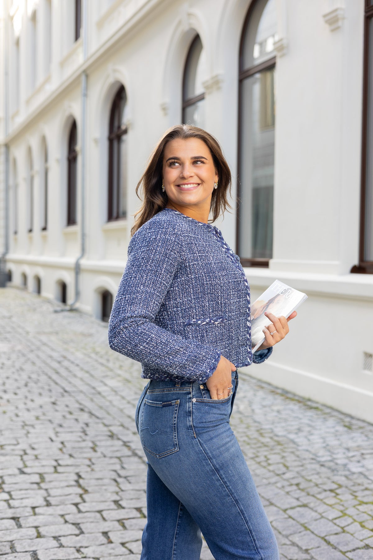 Lily Jacket fra Love Lolina. En must-have blazer for kontoret, designet med rett passform, elegant flettekant og lommer. Perfekt for å gi hverdagslooken din en gjennomført og sofistikert finish. Jakken har en litt kort passform, knappelukking foran, rund hals, to lommer og stoffknapper.