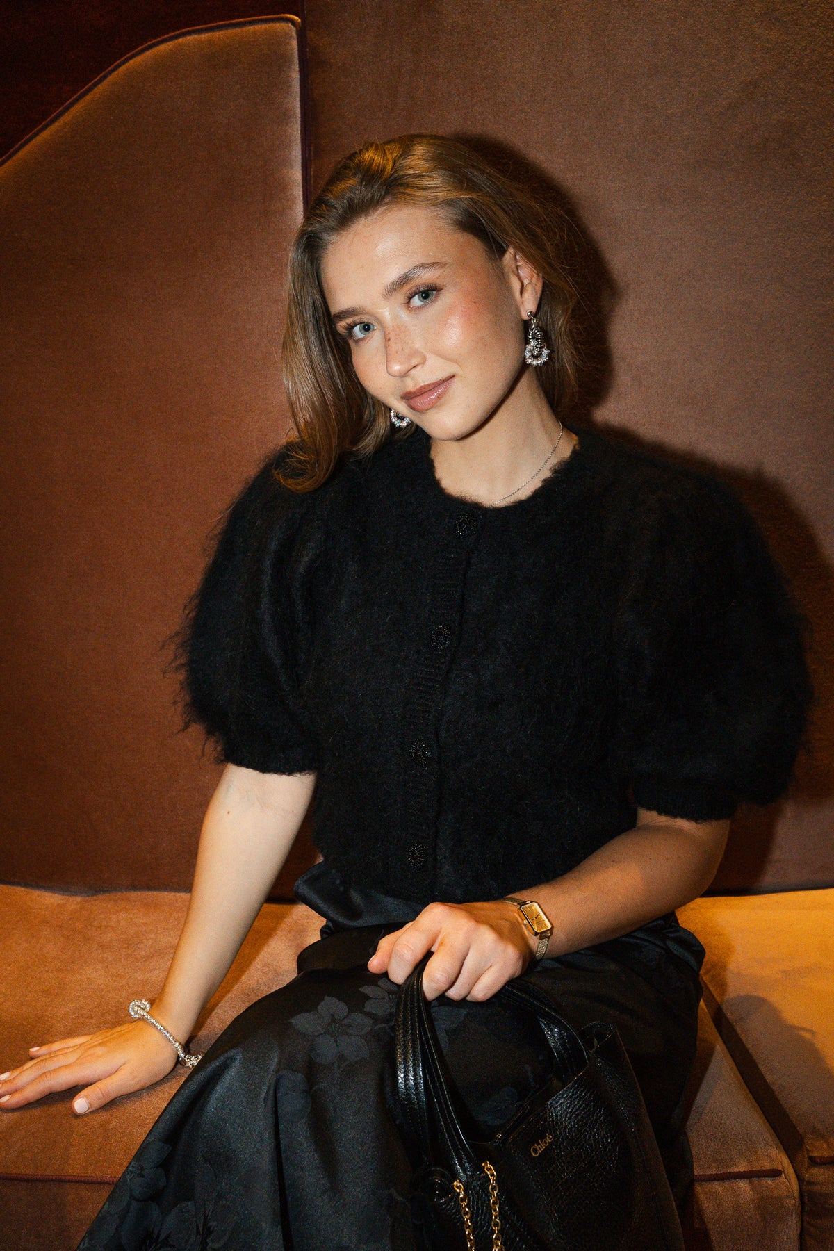 Hairy Knit Puffed Jacket er laget av vårt ekstra myke og lodne garn, sertifisert med RAS (Responsible Alpaca Standard). Jakken har en kort, figursydd passform med korte puffermede ermer og elastiske mansjetter som gir et delikat volum. Den runde halsen, mansjettene og nederkanten har vakre ribbestrikkede detaljer, og fronten lukkes med dekorative knapper som tilfører et elegant preg.