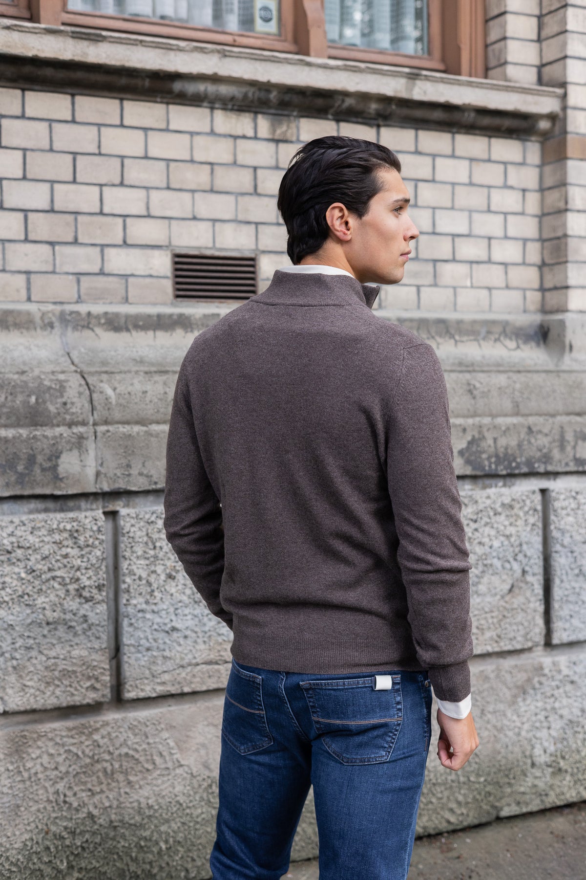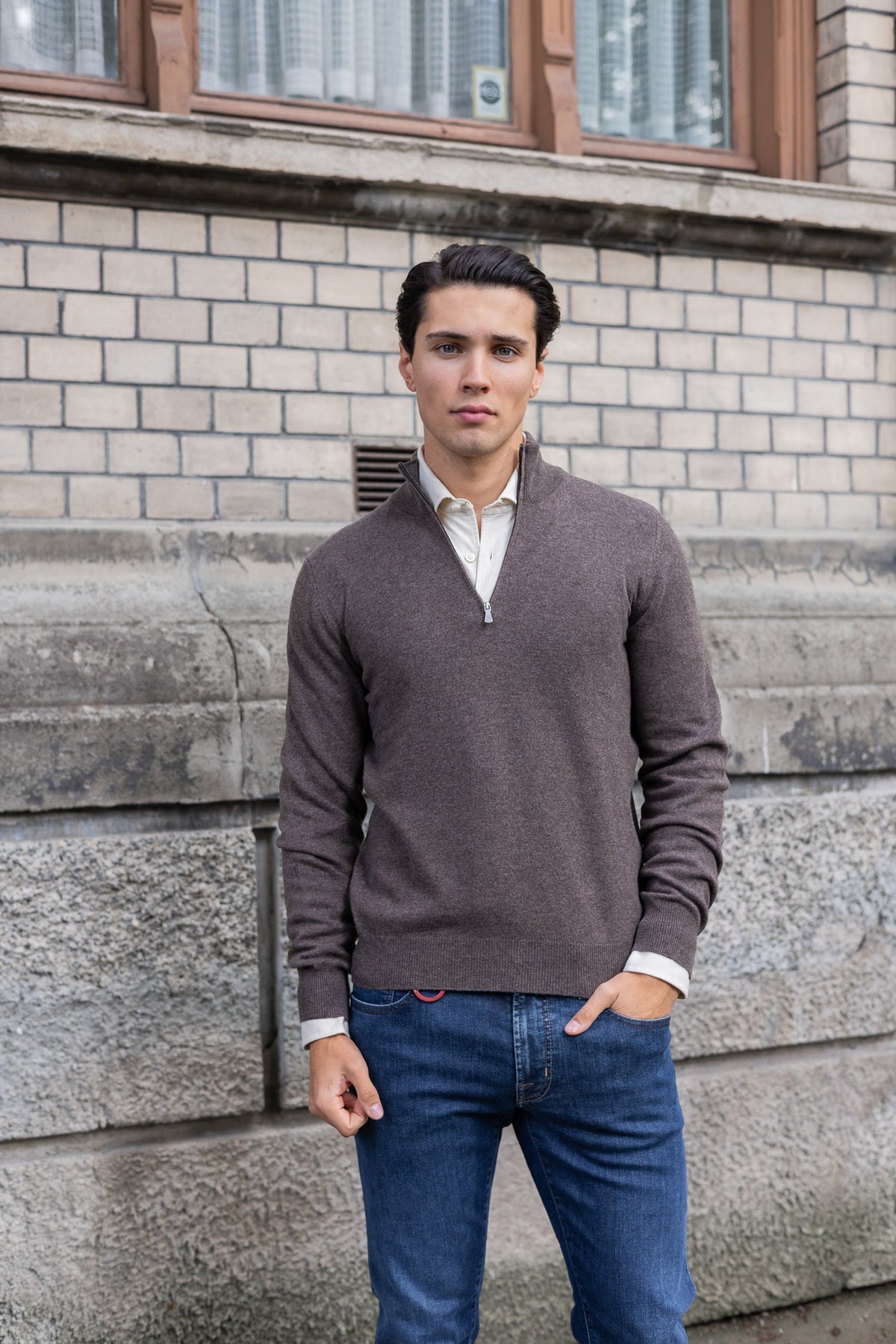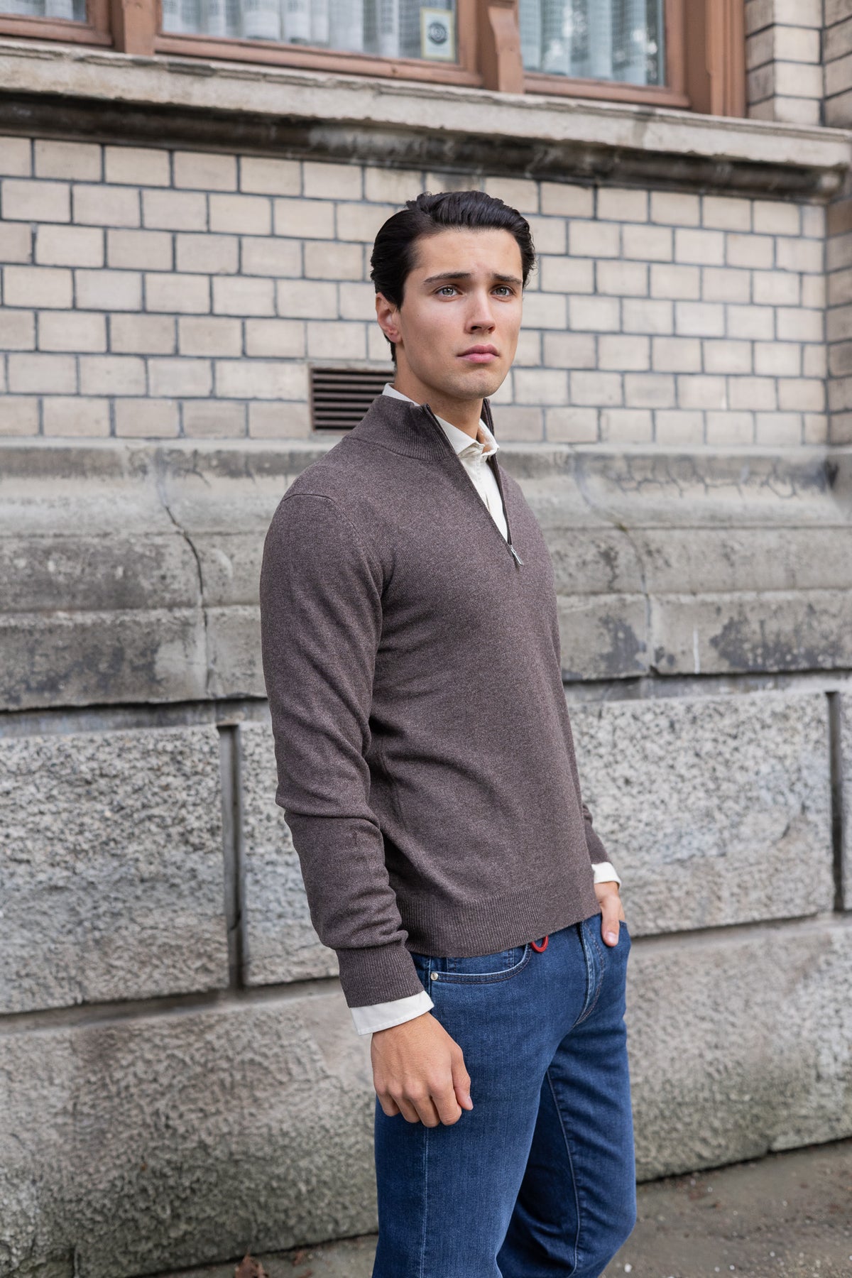 Mock Zip fra Gran Sasso. En allsidig genseren med half-zip, ribbestrikkede detaljer på halsen, ermene og nederst på plagget. Genseren har en normal passform, og med et klassisk og allsidig design passer den til både hverdagsbruk og til finere anledninger.