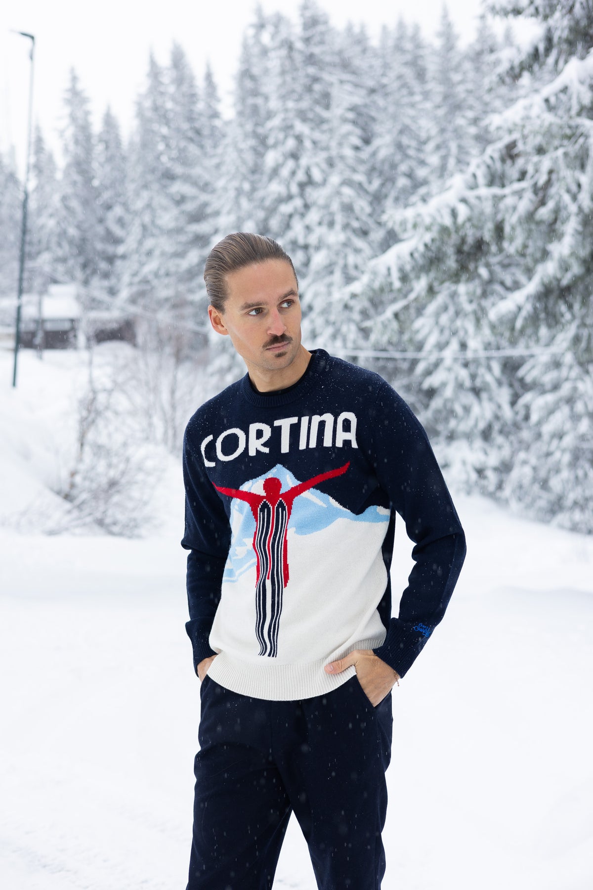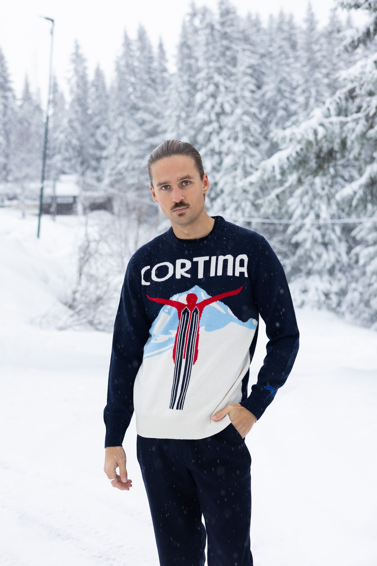 Heron Cortina Ski 61 fra MC2 Saint Barth. En stilig strikkegenser med rund hals, mansjetter og en normal passform. Genseren har et stilig motiv med en skihopper, og teksten "Cortina" foran. Enten du skal tilbringe dagen på ski, eller om du skal kose deg på afterski, så er denne genseren det perfekte valget.