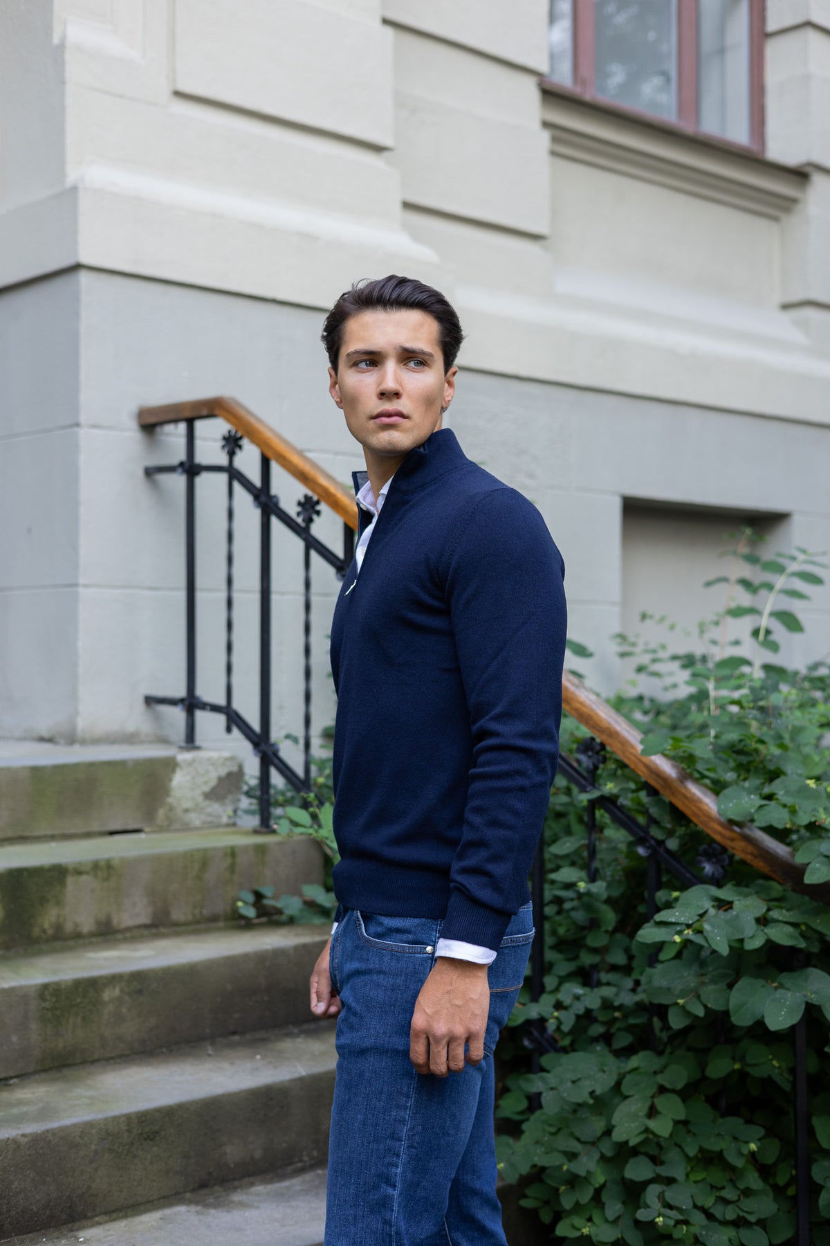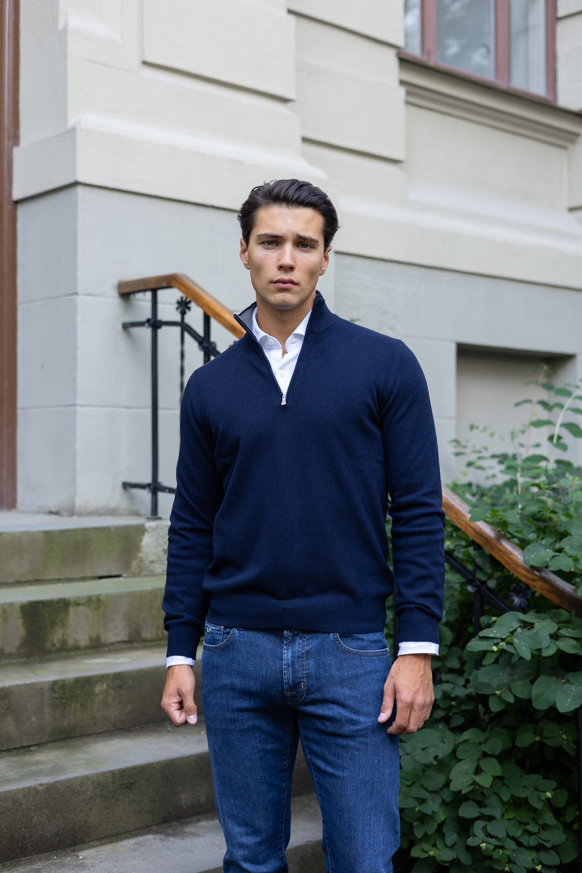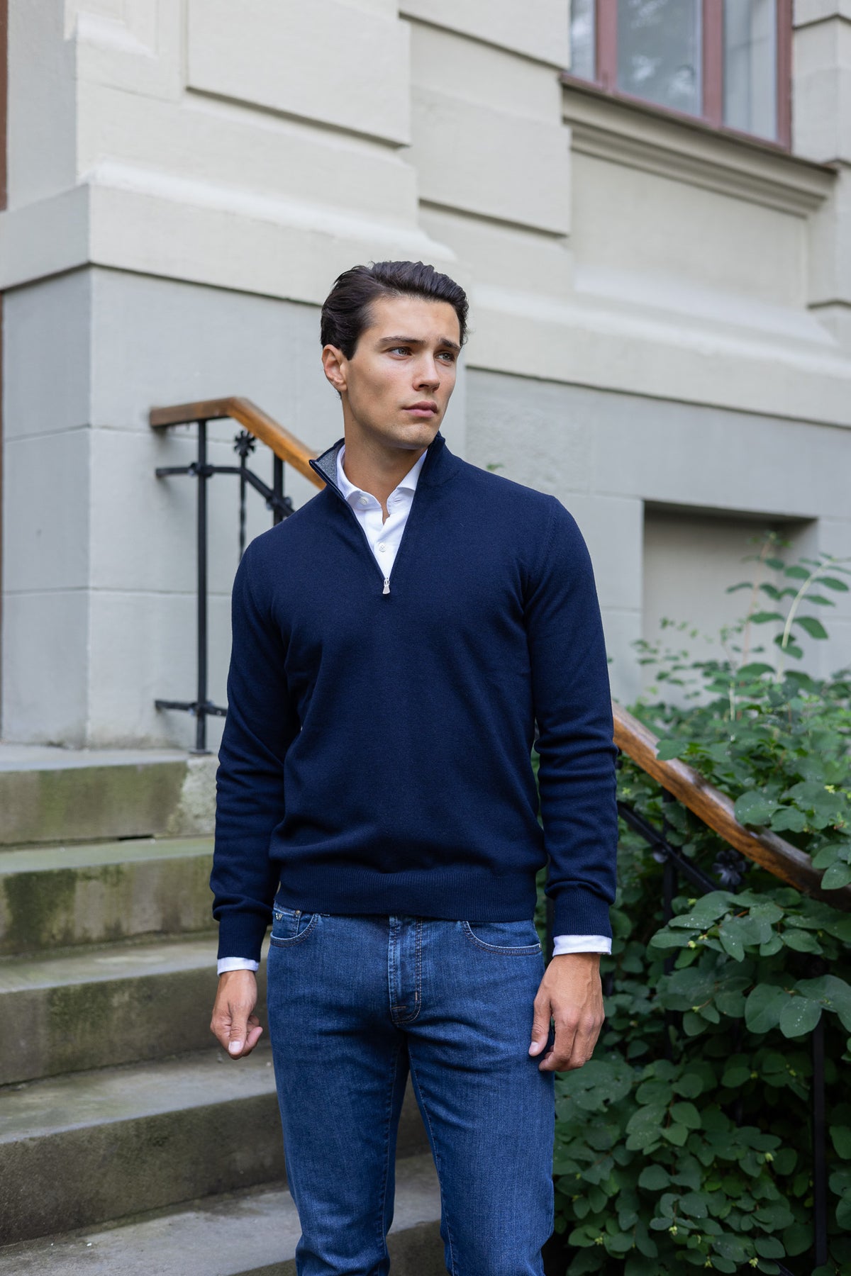 Mock Zip fra Gran Sasso. En allsidig genseren med half-zip, ribbestrikkede detaljer på halsen, ermene og nederst på plagget. Genseren har en normal passform, og med et klassisk og allsidig design passer den til både hverdagsbruk og til finere anledninger.