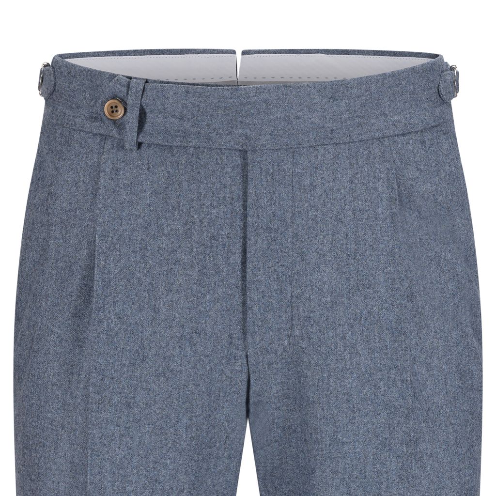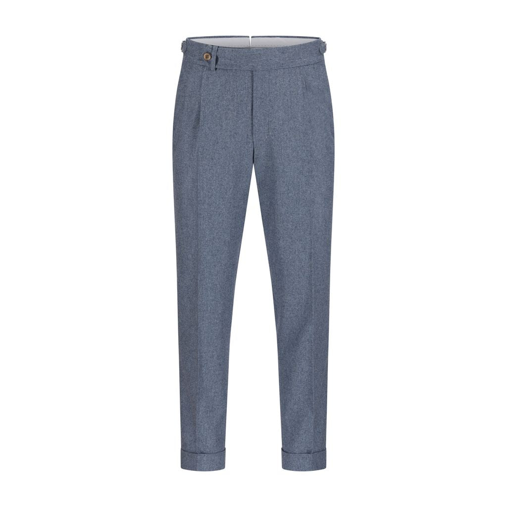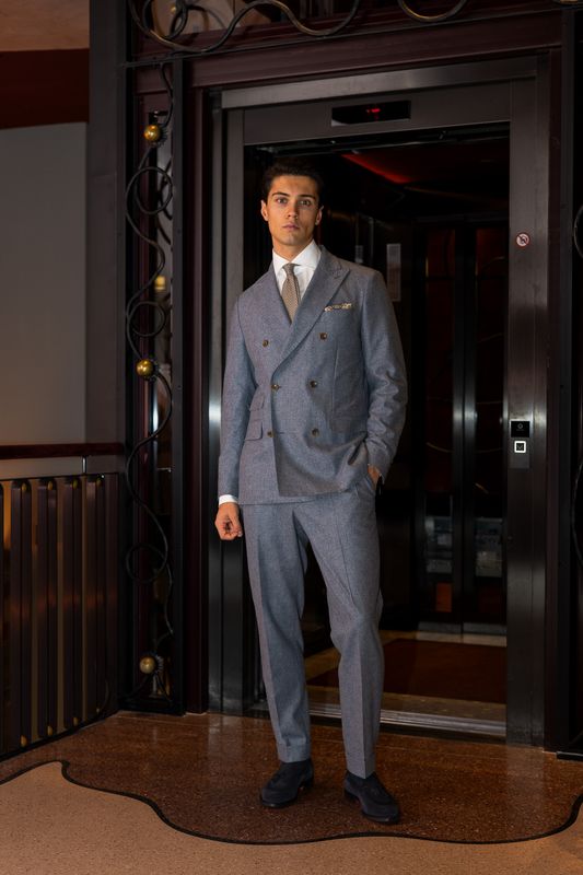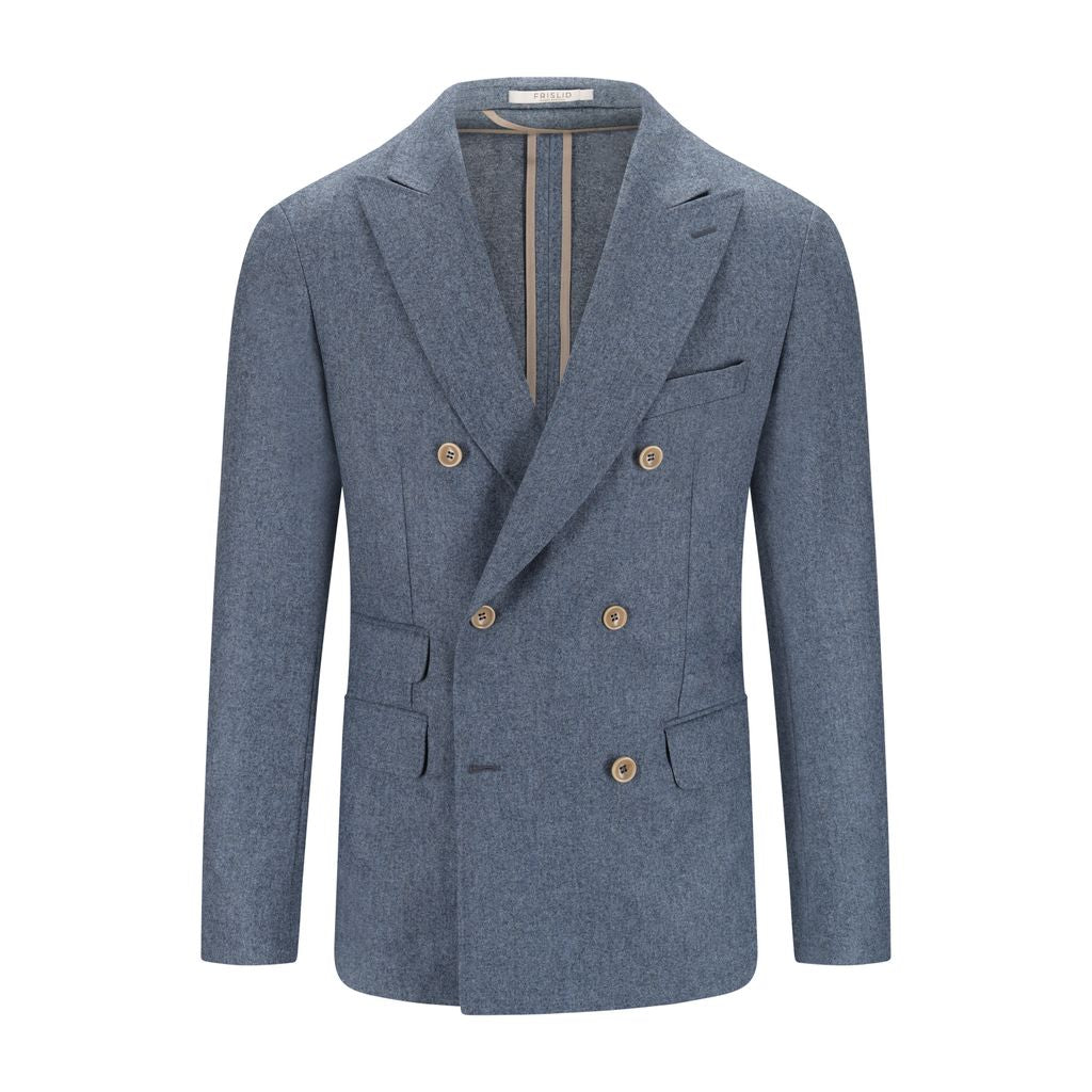 En elegant dobbeltspent dress fra Frislid i en delikat lyseblå farge. Dressen er laget i myk flanellull som gir en raffinert struktur og behagelig komfort. Jakken har beige knapper, mens buksen er utstyrt med sidespenner og legg i front for en klassisk og velbalansert silhuett. En sofistikert dress som passer perfekt til formelle anledninger.