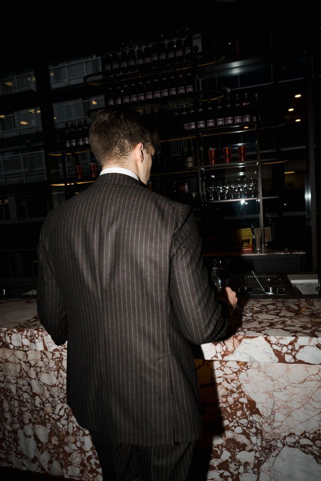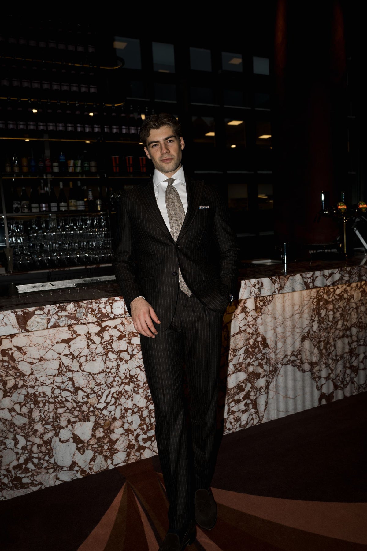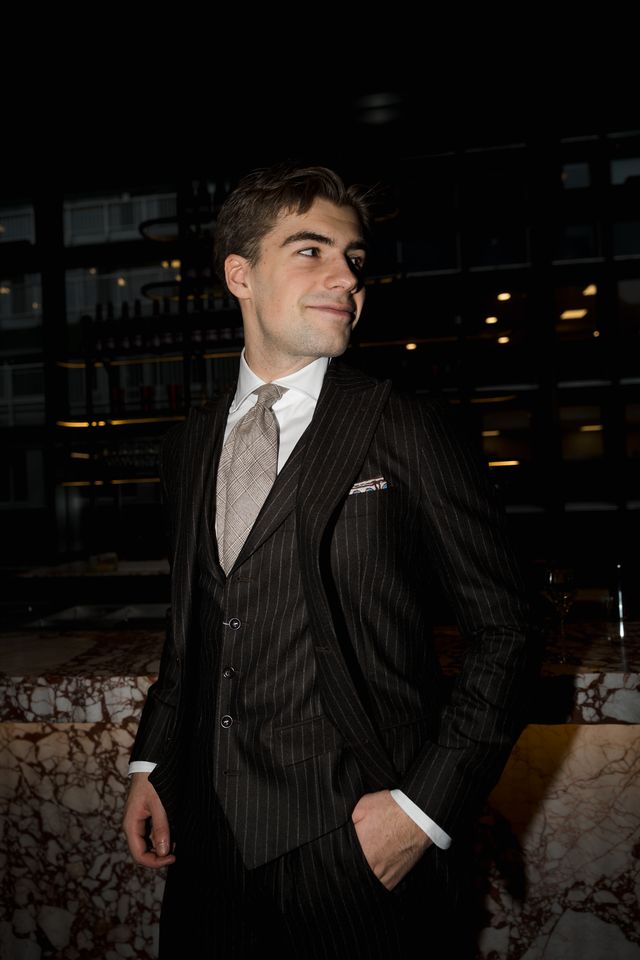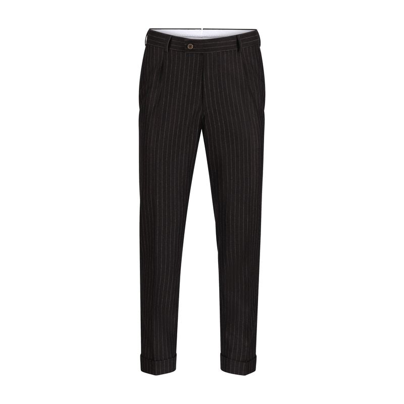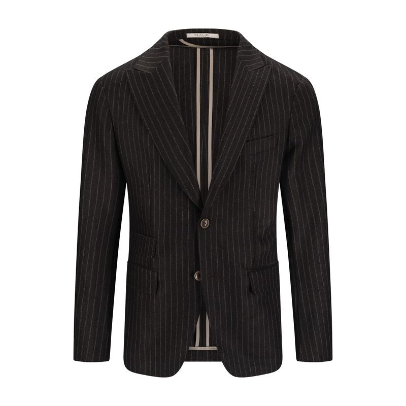 En elegant dress fra Frislid i ull, designet i en varm brun tone med klassiske, tynne striper. Jakken har spisse slag som gir et markant og stilfullt preg, mens buksen er utformet for en komfortabel og tidløs passform. Dressen kan kompletteres med en matchende vest for et fullt tredelt antrekk. En moderne tolkning av den klassiske stripete dressen – perfekt til både jobb og formelle anledninger.