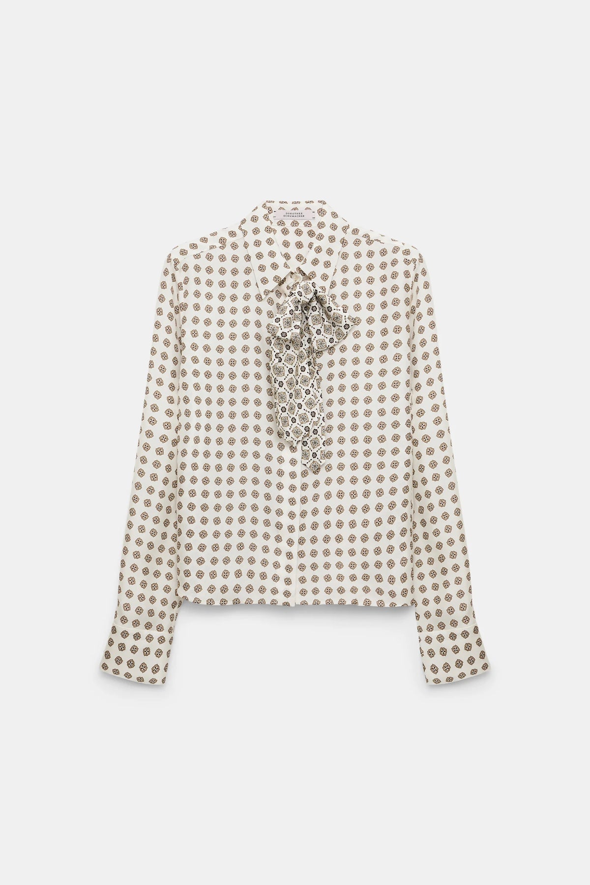Signaturmønstre, signaturstil: Blusen har en avslappet passform og er dekorert med vårt karakteristiske slipstrykk. Den er laget i silk twill og har et avtagbart knytebånd i halsen for et fleksibelt og elegant uttrykk.