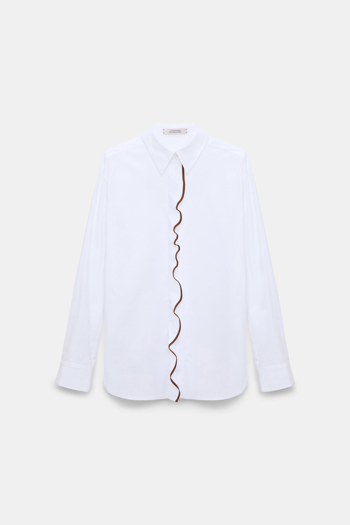 Skjorten i bomullspoplin har en avslappet passform og er designet med en skjult knappestolpe med volangkant og kontrastpiping. Mansjettene har splitt og knapper med samme kontrastdetalj, og på baksiden gir et bærestykke med én legg et elegant fall.
