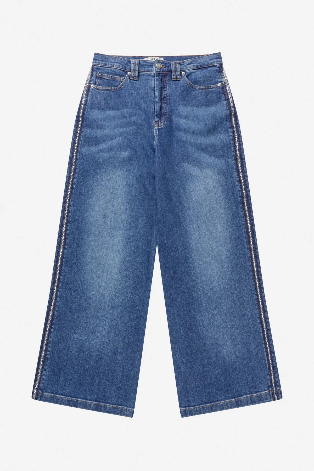Rewari fra Munthe. Elegante jeans med vide ben, stilig kontrastsøm langs sidesømmen. Jeansene har en brodert Munthe-emblemdetalj på baklommen, beltehempe og glidelås-og knappelukking.