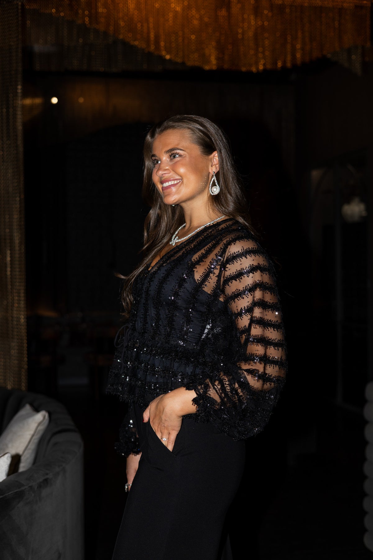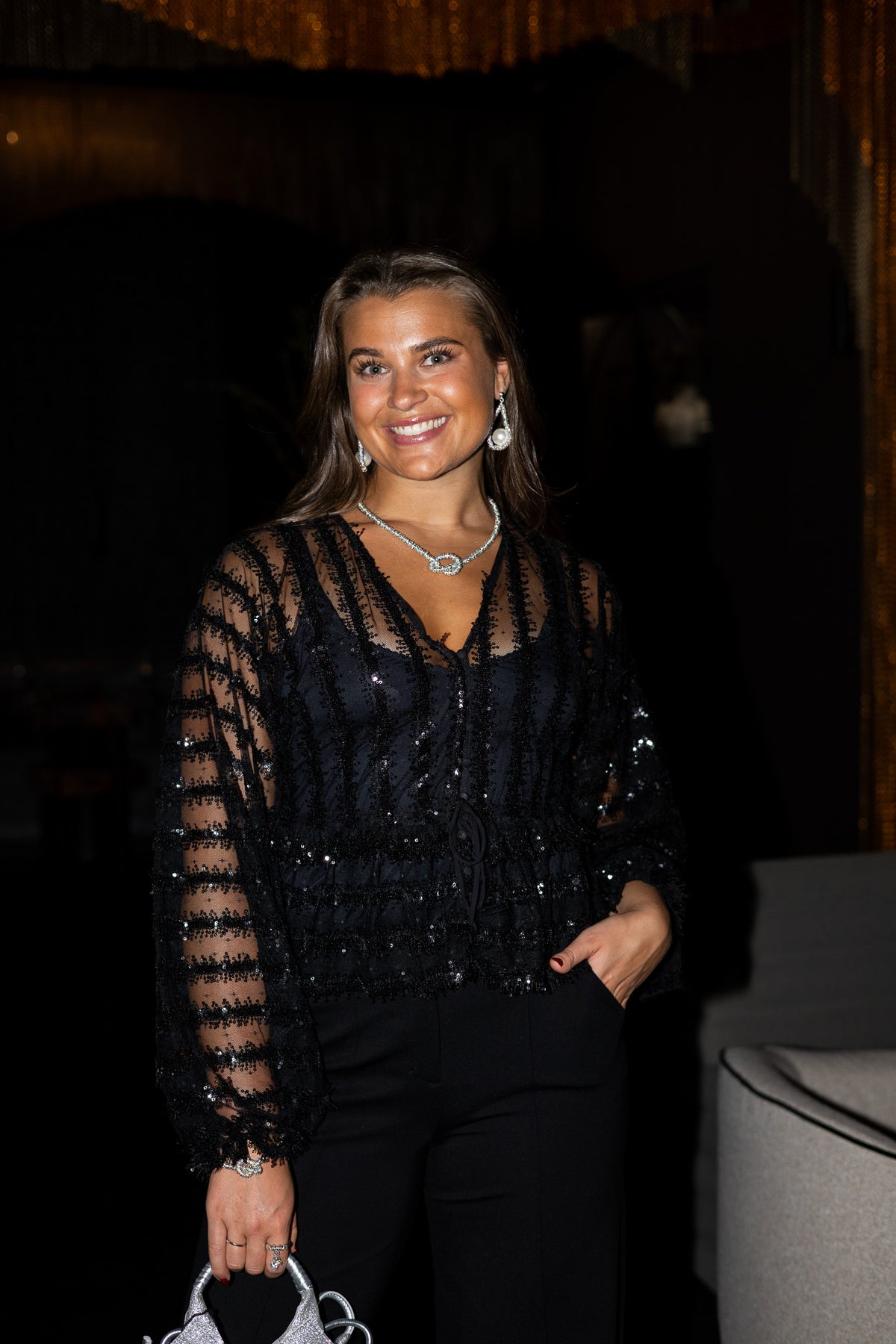Remona fra Munthe. Vakker gjennomsiktig paljettbluse med lange, lett puffede ermer og en feminin V-hals. Toppen har knyting i midjen som kan lukkes med en fin sløyfe.