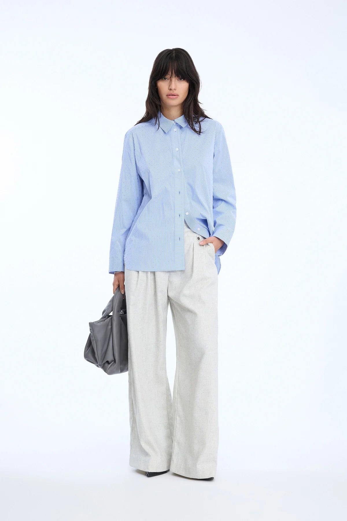 En vakker fortolkning av den klassiske skjorten, utsmykket med elegante små similisten. Skjorten har nålestriper som er rotert slik at de ligger horisontalt langs knappestolpen. Den har lange ermer med stilfulle mansjetter og er designet med en løs og ledig passform.