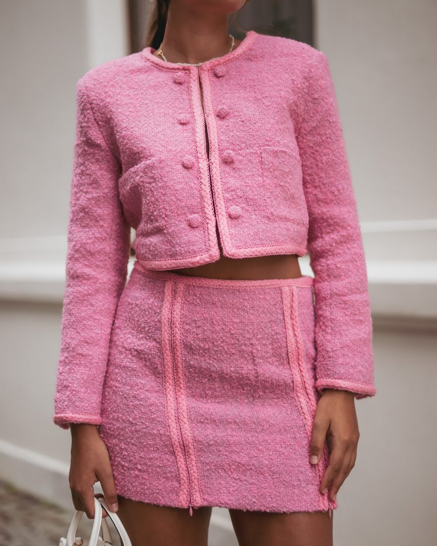 Et stilig skjørt fra Rotate. Skjørtet har en minilengde, laget i et tweed-stoff.