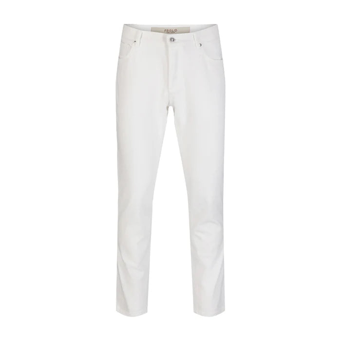 En klassisk jeans fra Frislid i hvit denim. Modellen har regular fit som gir en komfortabel passform med rett ben, og er laget i en myk bomullskvalitet med stretch for økt bevegelighet. En allsidig bukse som passer perfekt til sommergarderoben, og som enkelt kan styles både til skjorte og blazer eller til en mer avslappet look med T-skjorte.